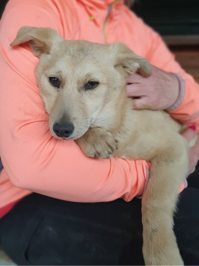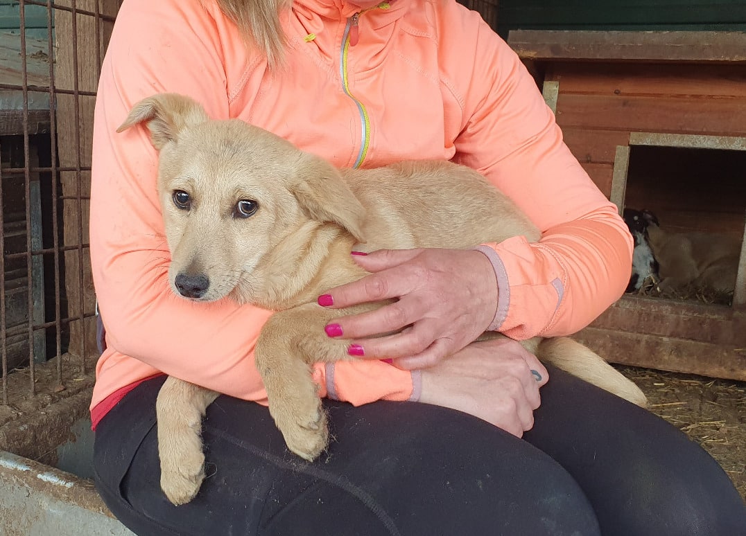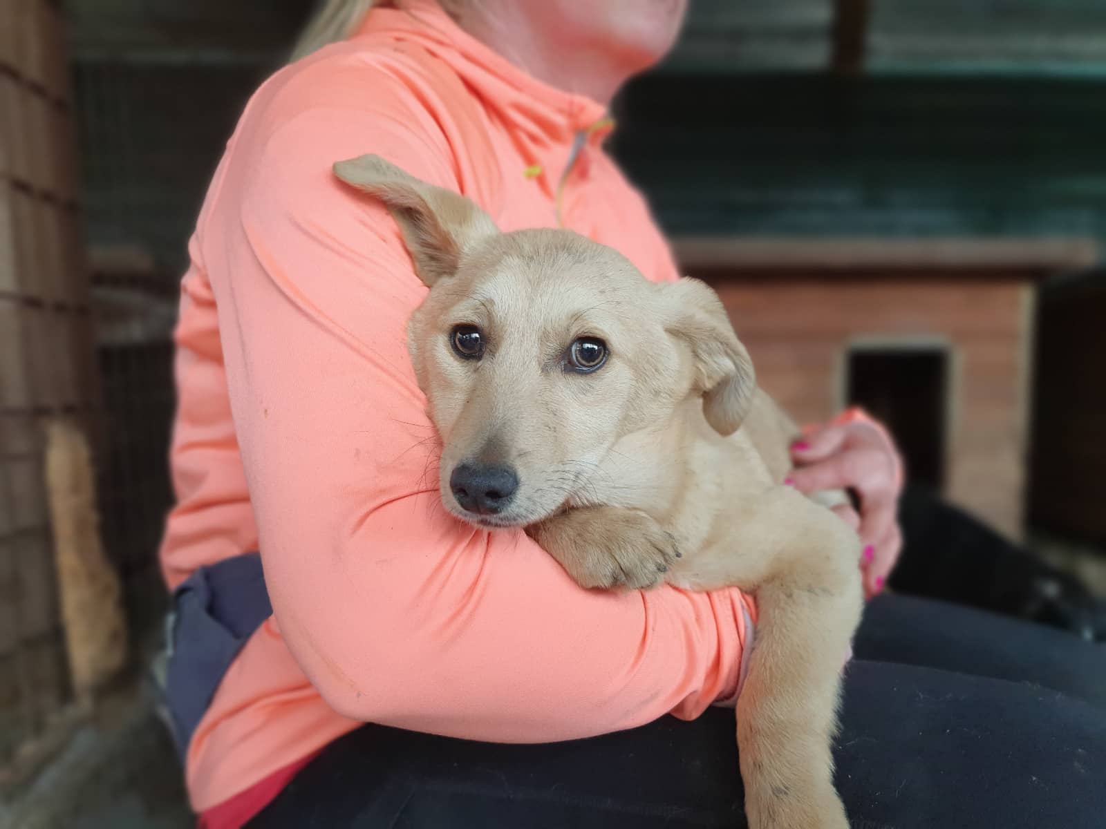 Dieser cremefarbene Schatz ist noch etwas unsicher, aber er zeigte uns, dass er auf dem richtigen Weg ist. 2 Tage vor unserem Besuch im April `25 wurde er erst frisch kastriert und war deshalb auch noch ein wenig eingeschüchtert. Da hat man schließlich gerade erste eine OP überstanden und schon kommen wildfremde Tanten und wollen einen schon wieder anpacken und auch noch auf den Arm nehmen. Zudem kennt XX Liebe und Zuwendung von Menschen noch nicht. Und trotzdem ließ er sich in der Hütte behutsam einfangen und sogar auf den Arm nehmen – dort entspannte er sich schnell und schlief fast ein. XXX lebt derzeit mit acht weiteren Junghunden im Zwinger und wird in einem eigenen zu Hause sicherlich schnell auftauen.