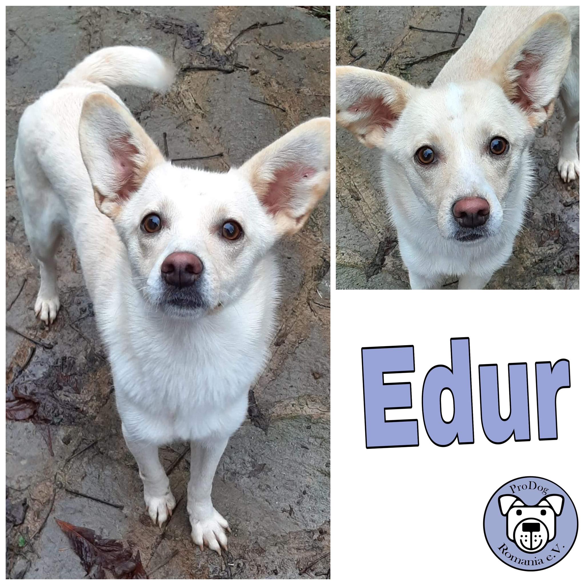 Edur ist ein lebhafter, verspielter und verschmuster Rüde, sehr auf Menschen bezogen und möchte am liebsten überall dabei sein. Er ist neugierig, aufgeweckt und lernwillig.