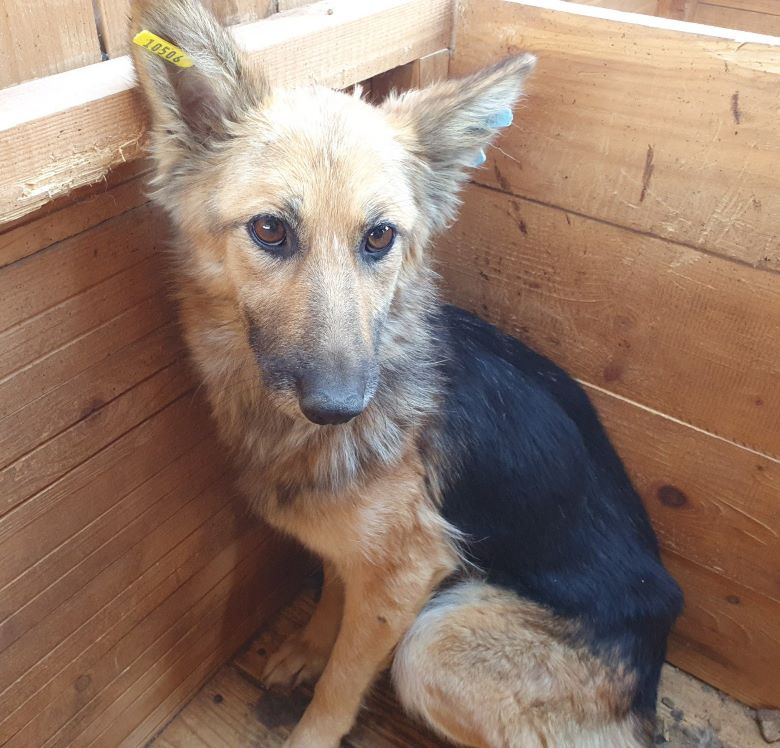 süße Hündin, die wie ein zu klein gebliebener Schäferhund aussieht