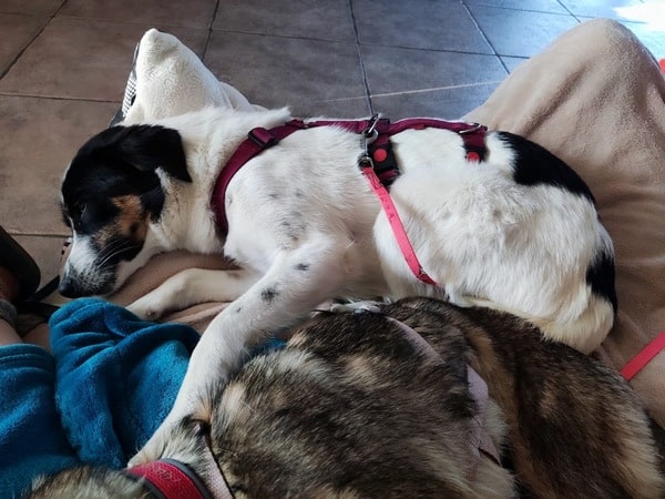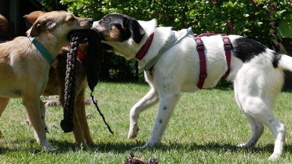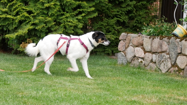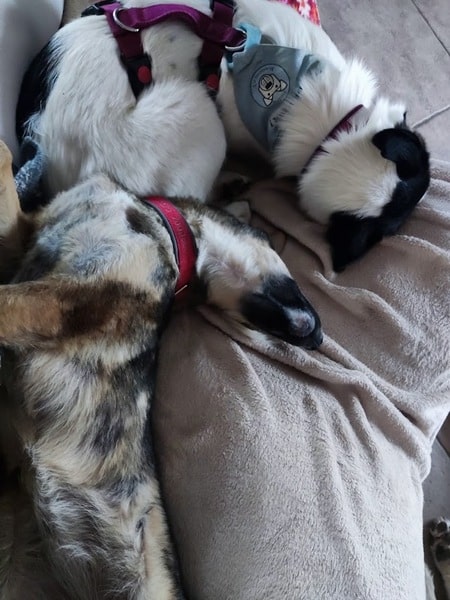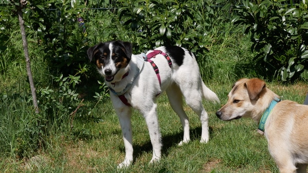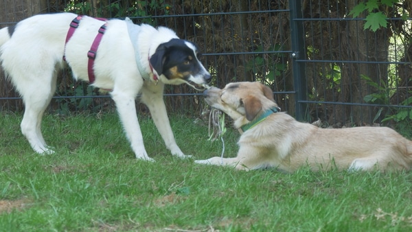 Denn allzu leicht erschrickt sie noch, es keimt Panik in ihr auf, alte Bilder scheinen in ihr aufzuploppen. Dann braucht sie Sicherheit, Gewissheit, bedingungslosen Halt. Und wird daran wachsen und die bösen Geister irgendwann auch überwinden. Hier bei uns hat sie es gut geschafft; hier ist sie eine fröhliche Hündin, die sich ans Pflegefrauchen gehängt hat und mit den PS-Schwestern inzwischen lustig durch den Garten tollt. Dabei holt sie sich immer wieder Rückendeckung vom Pflegefrauchen, kleine bestärkende Streicheleinheiten, dann geht es weiter.