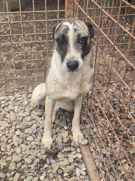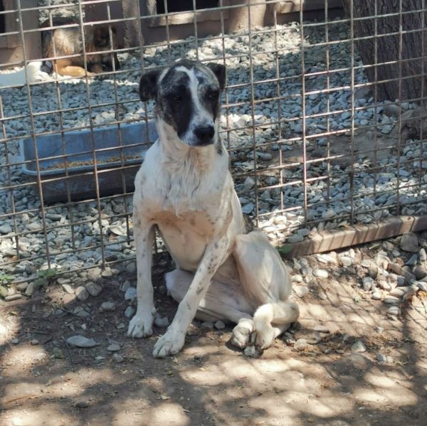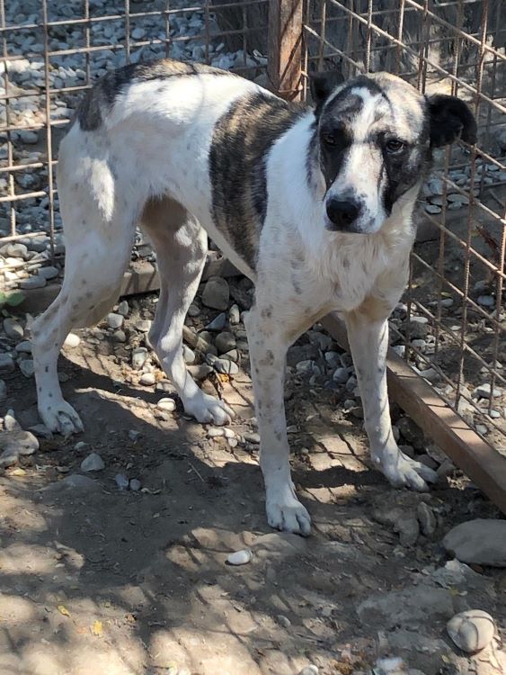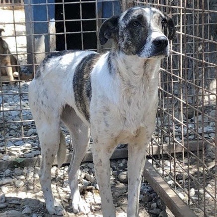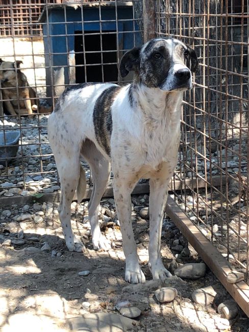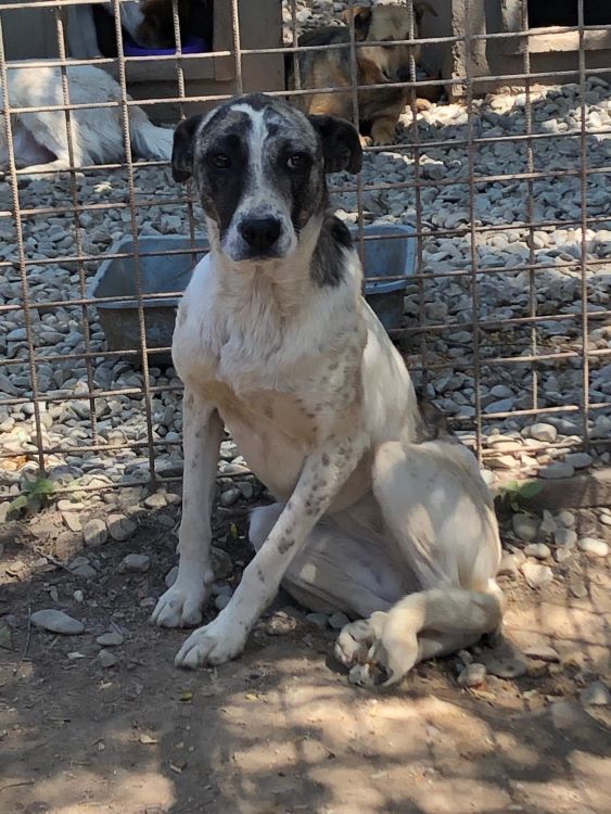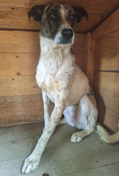Diese hübsche Hündin sitzt mit einem sehr zutraulichen Rüden zusammen, der uns überschwänglich begrüßte als wir den kleinen Kennel betraten. Sie selbst hat sich währenddessen in der Hütte verkrochen. Nach einer Weile entspannte sie sich etwas und setze sich dann auch außerhalb der Hütte hin um uns zu beobachten. Wenn man mehr Zeit mit ihr verbringen würde, würde sie sich sicher bald mehr trauen.