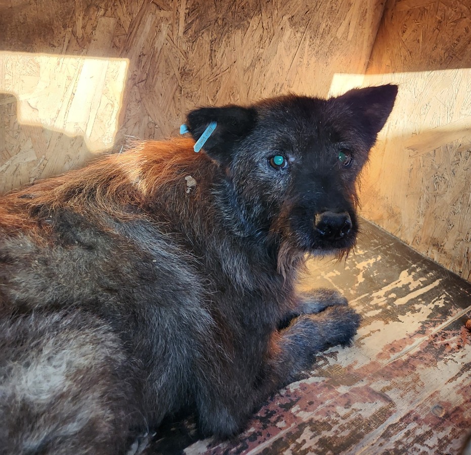 Das kleine Hundemännlein EMMO versteckte sich in der Hütte während unseres Besuchs im Kennel. Als wir ihn bedrängten und mit der falschen Hand berührten, zeigte er deutliches Abwehrverhalten. EMMO beruhigte sich dann aber zunehmend, sodass er dann sogar die angebotenen Leckerchen vom Boden annahm.