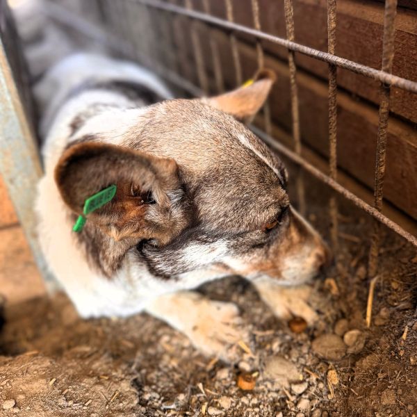 Dieses arme Wesen klemmte zwischen Gitter und Hütte und war erstarrt vor Sorge. ENGELE konnte sich nicht vor oder zurück bewegen, zu groß war die Furcht vor dem was passieren könnte. Wir konnten ENGELE jedoch anfassen, ohne dass auch nur das geringste Schnappverhalten kam, so dass wir denken, dass ENGELE nach einiger Zeit auftauen könnte. Mehr Zeit und Geduld könnten ENGELE vermutlich aus dieser Not befreien. Wir hoffen, dass ENGELE durchhält und von großherzigen Menschen entdeckt wird. Bitte ganz bald – zu viel Zeit ist schon wieder verstrichen.