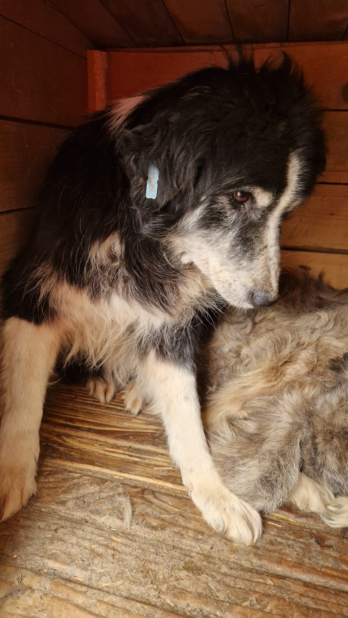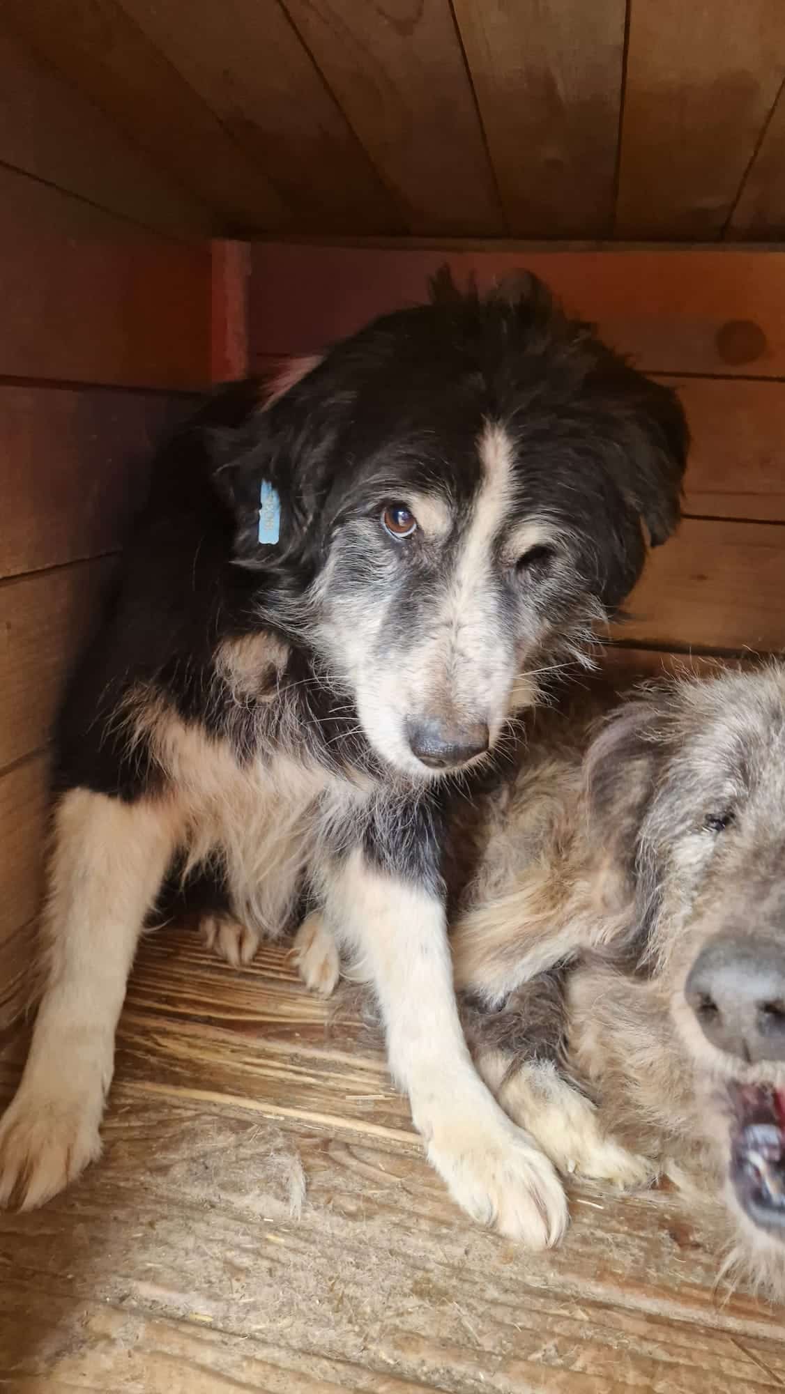 ENID lag zu Beginn unseres Besuchs auf dem Hüttendach und beobachtete uns entspannt aus der Ferne, als wir uns mit den anderen Hunden im Kennel beschäftigten. Als wir unsere Aufmerksamkeit auf ihn /sie legten, verließ ihn/sie allerdings der Mut und ENID begab sich in die sichere Hütte. Dort konnten wir ihn/sie unter Bedrängnis streicheln. Dies konnte ENID nicht genießen, versteinerte dabei, blieb dabei aber immer defensiv und zeigte kein Abwehrverhalten.
