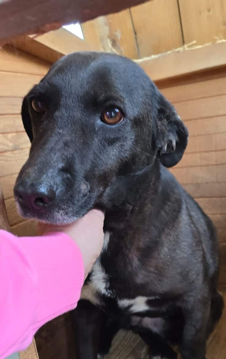 Die nette ESJE hätten wir fast übersehen, denn sie lag alleine und zurückgezogen in einer Hütte. Als wir uns ihr zuwandten, wedelte sie ganz zart mit ihrem Schwänzchen. Wir konnten sie sofort problemlos streicheln, sie wirkte devot und ließ sich den Bauch kraulen. Wir haben dann das Hüttendach geöffnet um besser an sie ranzukommen. Hier spürte man, dass die sehr liebe Hündin leicht verunsichert war, aber sie blieb durchweg nett zu uns und ließ sich gut streicheln. Interaktionen mit anderen Hunden konnten wir aufgrund der Auffindesituation nicht beobachten. Wir schätzen ESJE aber aufgrund ihres eher ruhig wirkenden Wesens als grundsätzlich verträglich ein.