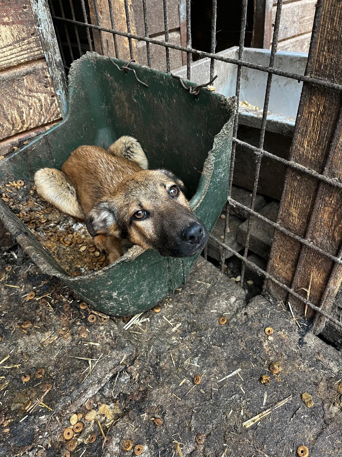 Er lebt mit ganz kleinen Welpen und weiteren Hunden in einem Kennel, was für ihn gut funktioniert.