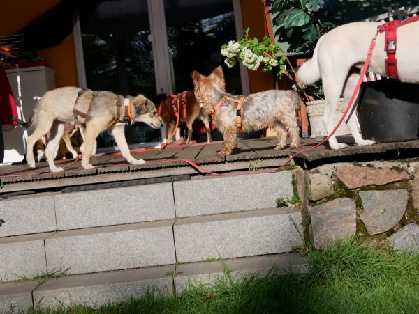 Sie lebt hier in einem gemischten Rudel und versteht die Hundesprache perfekt. Dort wo Zurückhaltung angebracht ist, ist sie zurückhaltend. Und dort, wo gerne auch gespielt wird, ist sie eifrig auch dabei. Wenn es ihr zu viel wird, setzt sie korrekte Signale zum Abbruch und macht sich klein und still. Klappt auch wunderbar.
