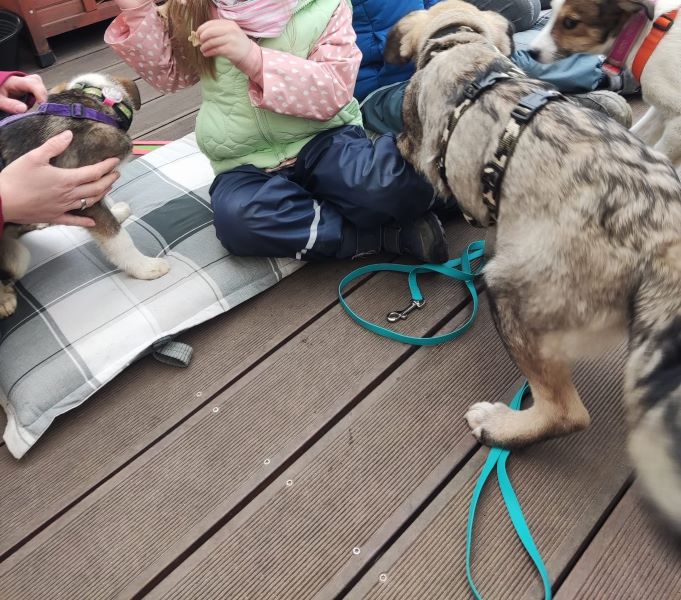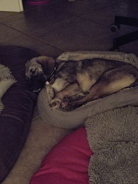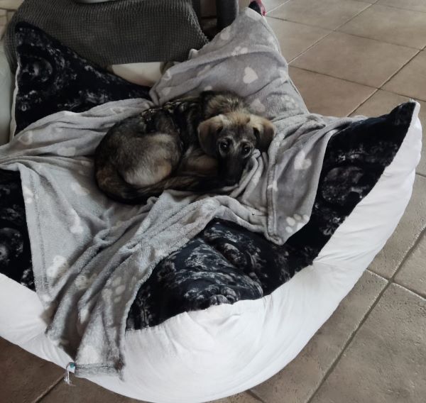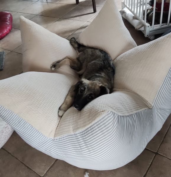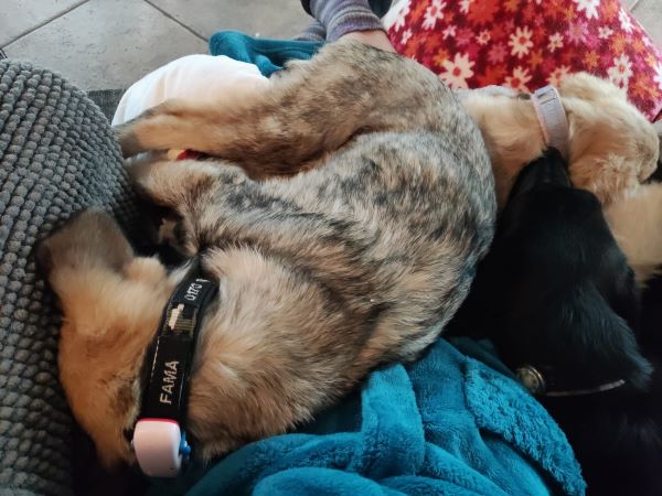 Mit den Katzen indoor ist es entspannt; samt PS-Frauchen wird gemeinsam auf der Krone gekuschelt. Outdoor mag auch Fama den Katzen noch hinterherlaufen, aber auch das wird im Laufe der Zeit schwächer. Fama zeigt an, wenn sie raus muss; ist man aufmerksam dabei, klappt es mit dem Stubenreinsein gut. Sie ist im Home Office ruhig dabei, kommt gut zur Ruhe. Mit ihren PS-Geschwistern ist sie ist gerne im Garten; auch alleine liegt sie schon mal lässig in der Sonne. Hat sie genug davon, fordert sie Einlass. Alleine sein im Rudel klappt inzwischen gut, ganz alleine bleiben und Stadtleben kennt Fama noch nicht. Beim Autofahren ist sie ruhig dabei; in der Box jedoch fängt sie an zu wässern; im Fußraum mit Nähe zum PS-Frauchen klappt es deutlich besser und wir üben fleißig weiter.