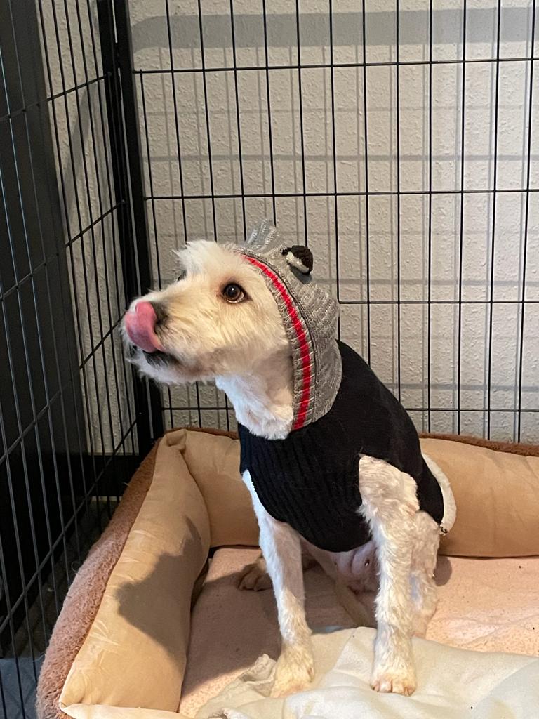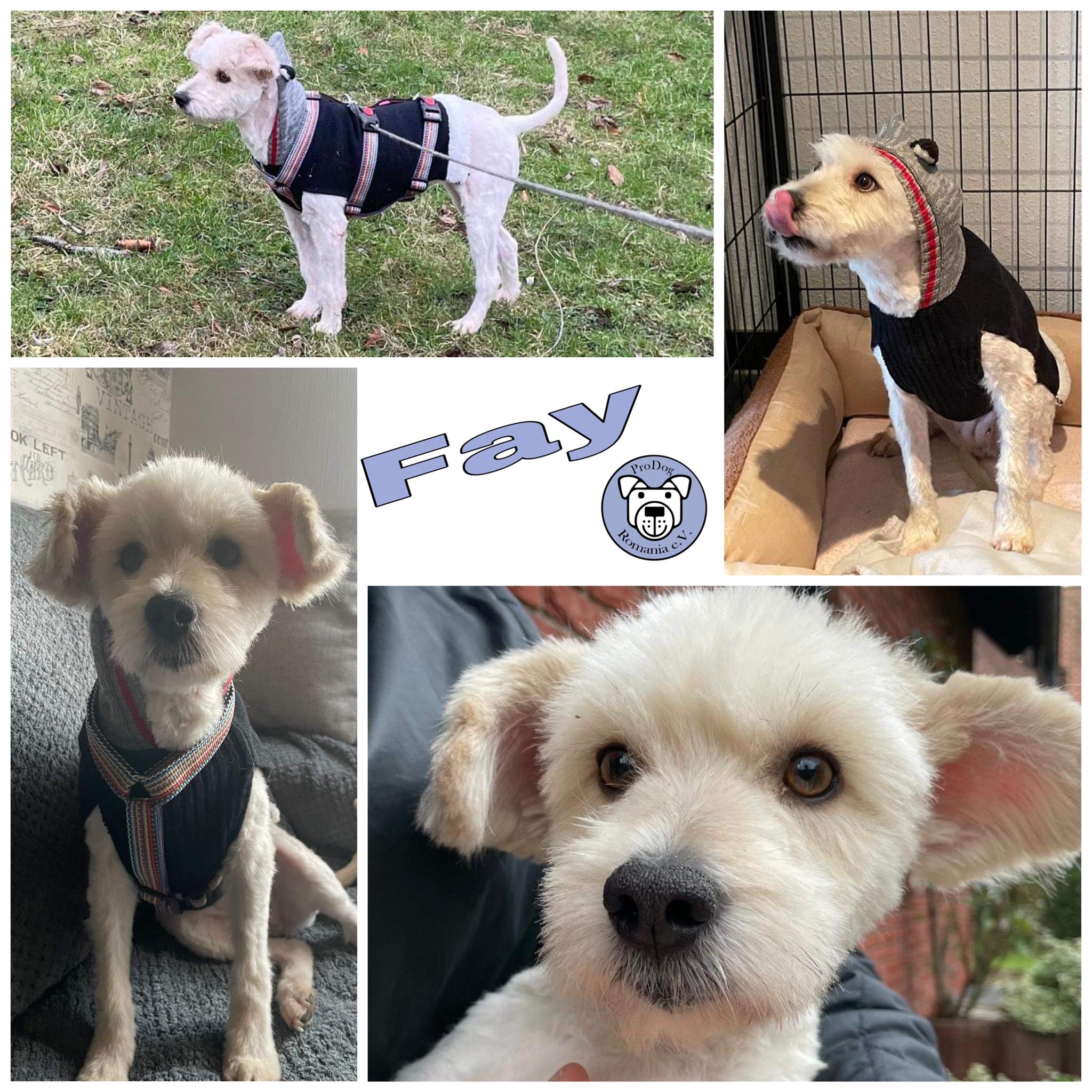 Fay hat langes, weißes Fell, regelmäßige Pflege ist unbedingt notwendig. Da sie stark verfilzt aus Rumänien bei uns ankam, mussten wir sie scheren lassen. Daher sieht sie auf den Fotos nicht aus wie üblich.
