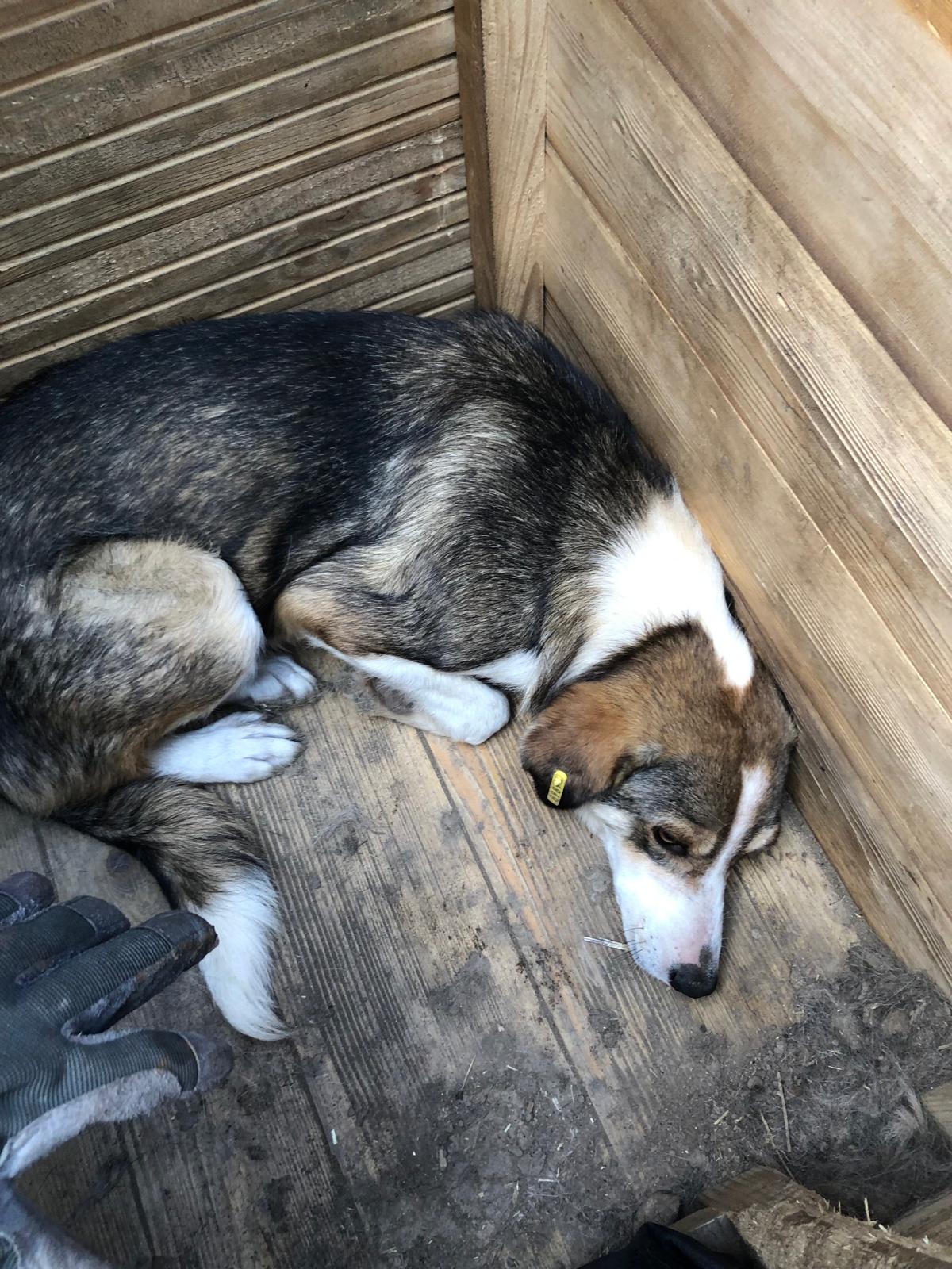 Der schüchterne Rüde begegnete uns ausweichend und wusste seinen menschlichen Besuch nicht so recht einzuordnen. In der Hütte angekommen zitterte er, ließ die Berührungen jedoch – zuerst mit der falschen Hand, dann getrauten wir uns ihn direkt zu streicheln – über sich ergehen. Man merkte dem unsicheren Hund mit der geduckten Körperhaltung aber an, dass er sich am liebsten unsichtbar gemacht hätte und sich beim Verlassen des Kennels Erleichterung breitmachte.
