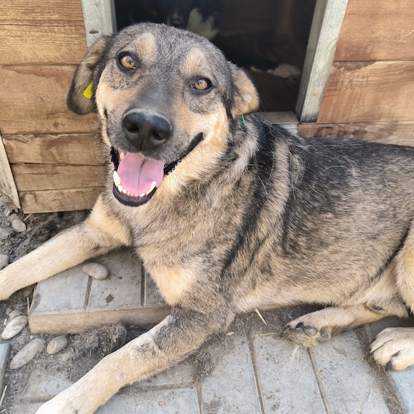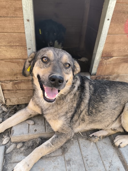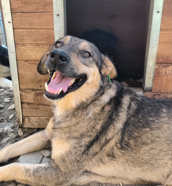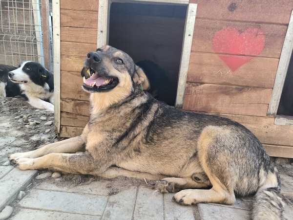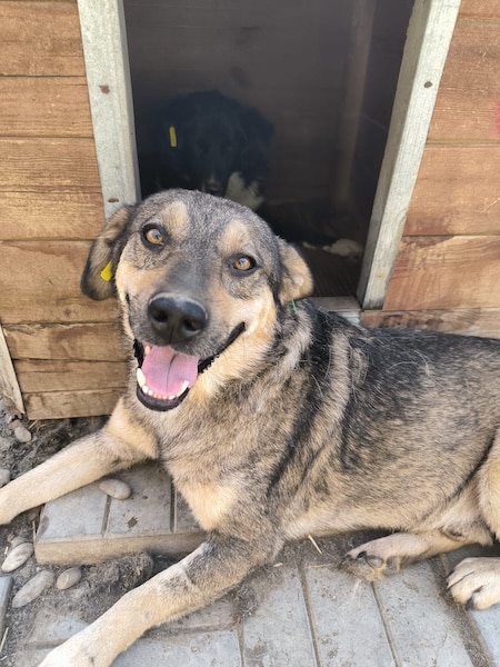 Dieser Rüde sitzt zusammen mit Rüden und Hündinnen in einem Kennel und scheint dort verträglich zu sein.