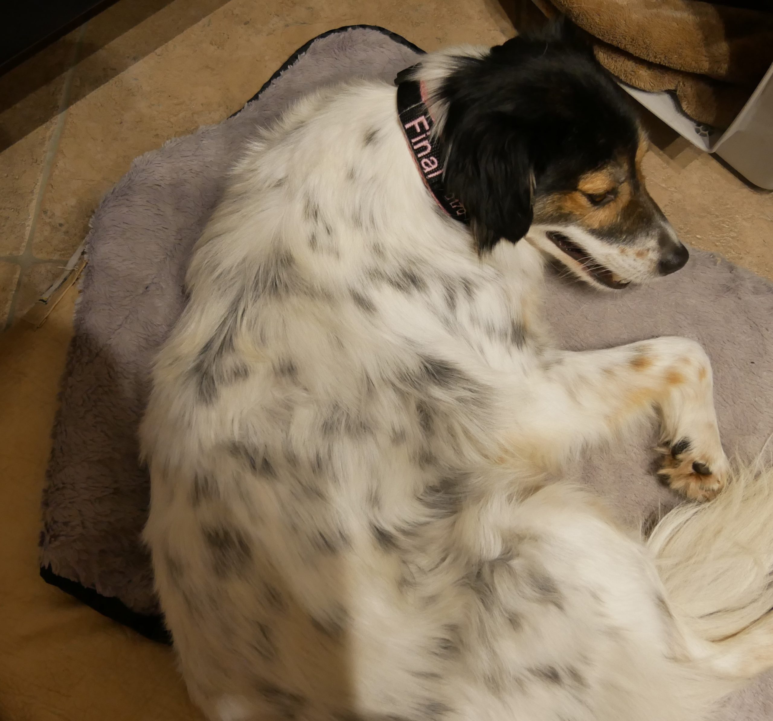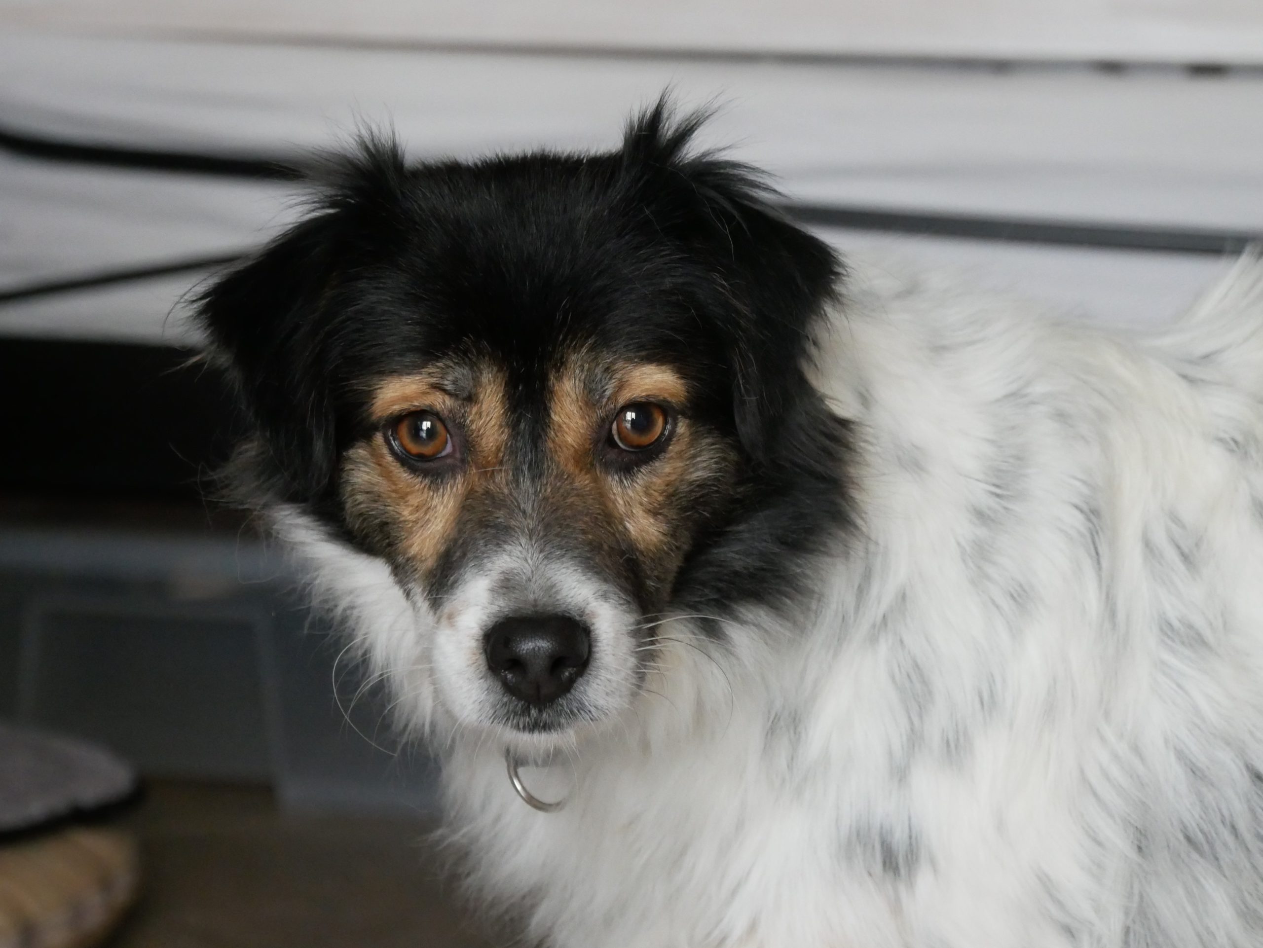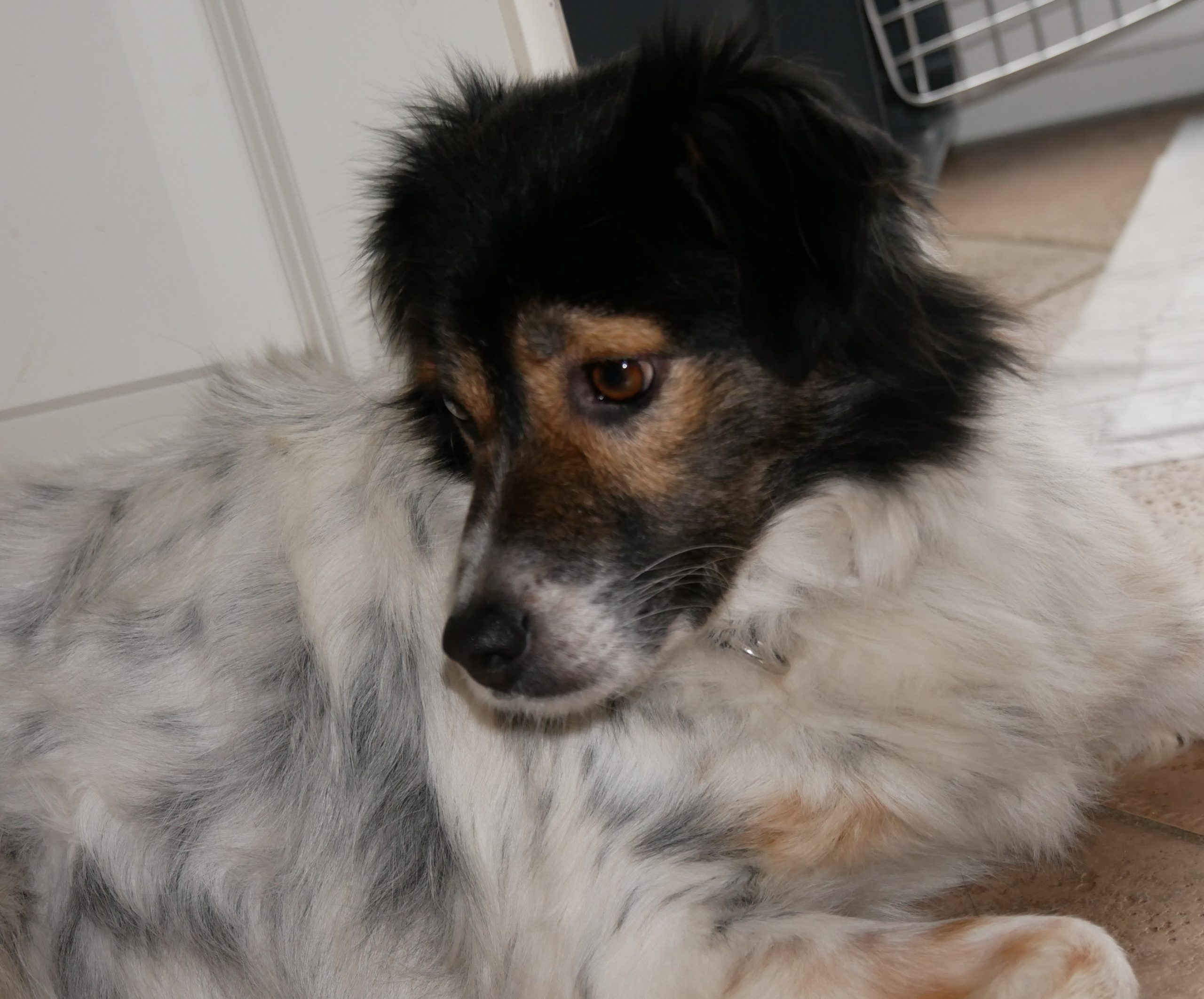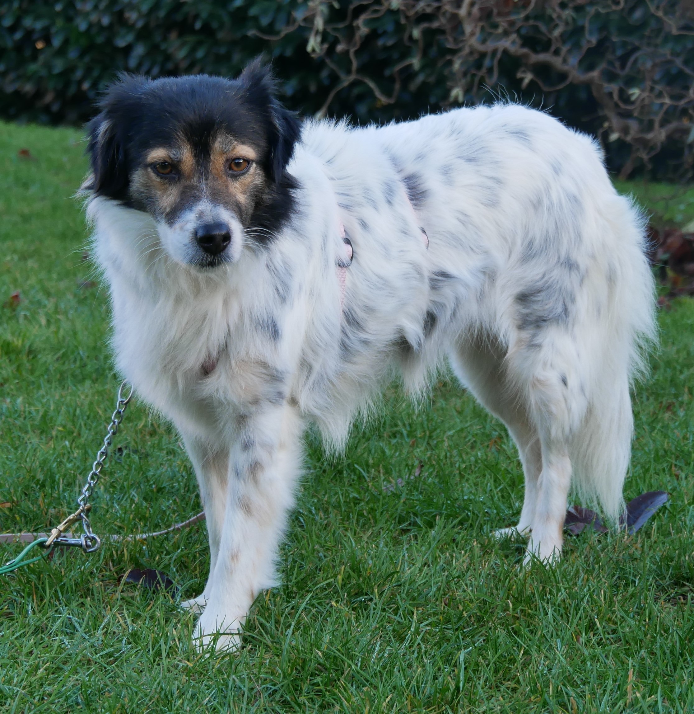 Liebe katzenfreundliche Hundedame Final Hündin kastriert 6 Jahre lt Pass, vermutlich aber deutlich jünger (ca. 3-4 Jahre) 45cm, 15,7kg Australien Shepherd – Münsterländer – Mix in weiß mit schwarzen Flecken, dreifarbiges zierliches Köpfchen, weiches langes Fell, fedrige Rute.