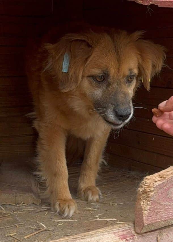 FINE wird immer mutiger, in der sicheren Hütte nahm sie auch schon ein Leckerchen aus der Hand. Außerhalb der Hütte weicht sie uns allerdings aus und lässt keine Nähe zu. Hier braucht es Menschen, die sich mit unsicheren Hunden auskennen.