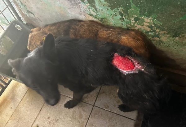 Im hintersten Innen-VetKennel sitzt dieser Rüde mit einer großen Bissverletzung auf dem Rücken. In diesen Bereich kommt kein Tageslicht. Immer im Dämmerlicht zu sitzen, ist heftig, aber aktuell der sicherste Ort fürihn im Shelter. Also kein Wunder, dass er Angst hatte und nicht wusste, was nun passiert als wir zu ihm gingen. Trotz dieser Angst konnten wir ihn anfassen ohne dass er uns einmal versuchte, abzuwehren. An einem schöneren Ort könnte es daher sein, dass er seine Angst verlieren und sich dem Menschen öffnen könnte. Da wir ihn aber aufgrund seiner Verletzung nicht weiter bedrängt haben, müssten seine Menschen auch mit scheueren Hunden umgehen können. Eine verlässlichere Aussage können wir aufgrund der schwierigen Situation vor Ort nicht treffen. Er ist verträglich. Bitte lasst ihn nicht im Dunkeln sitzen.