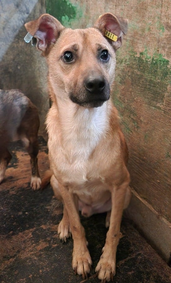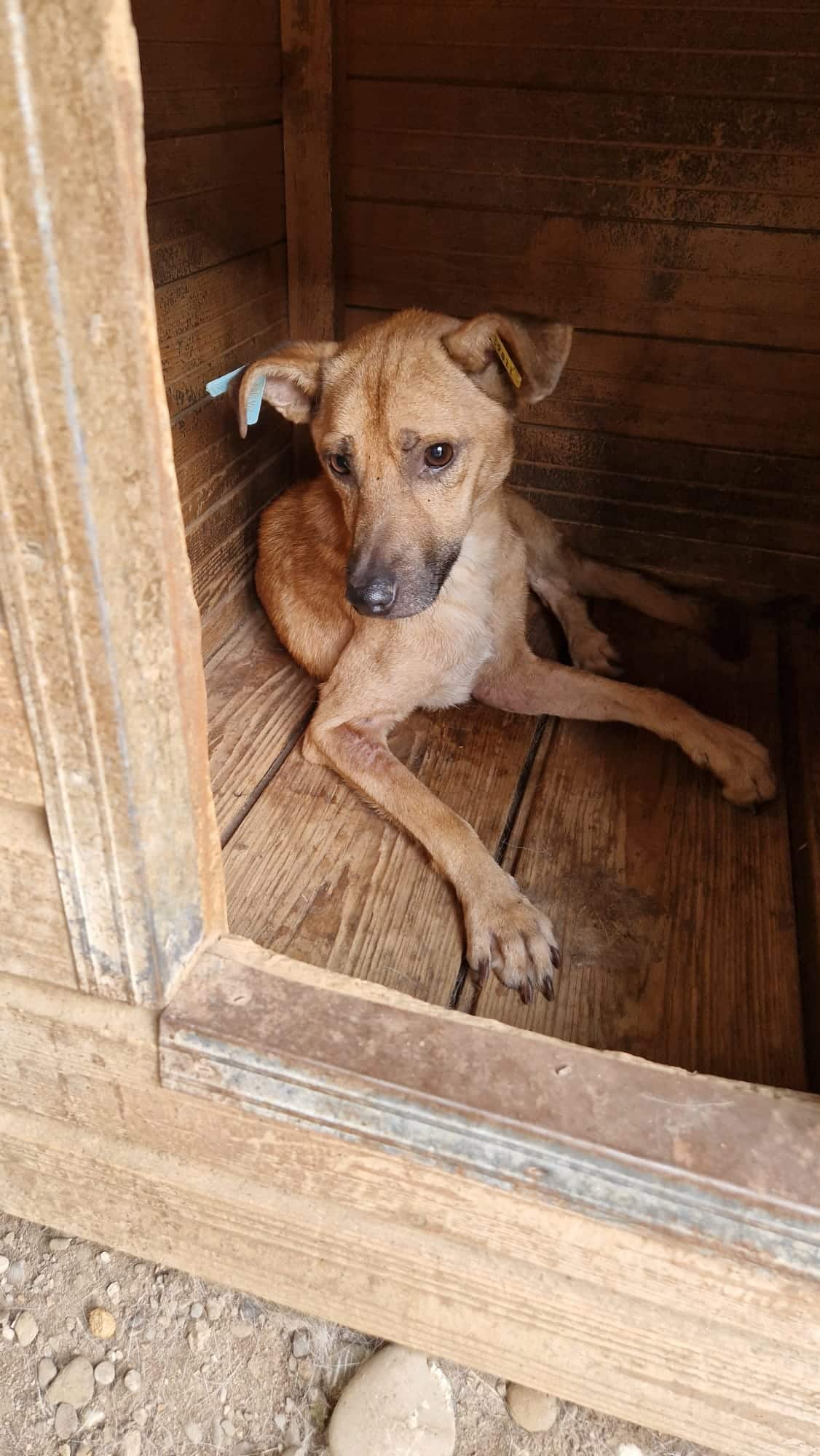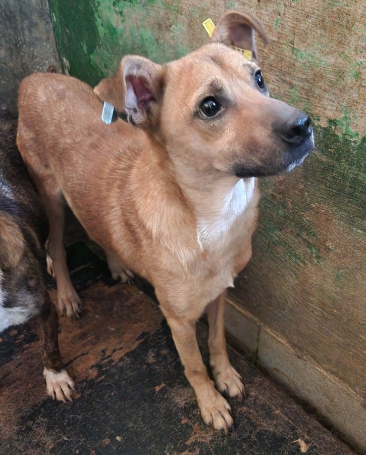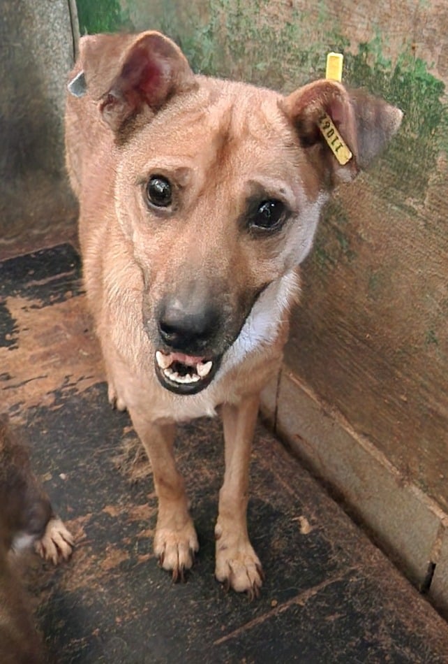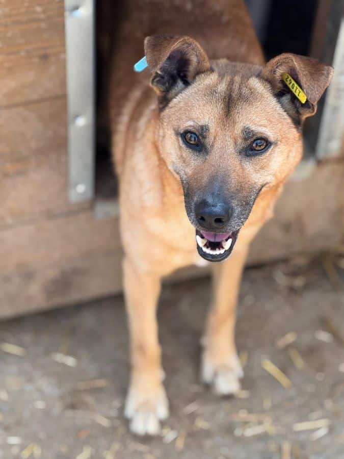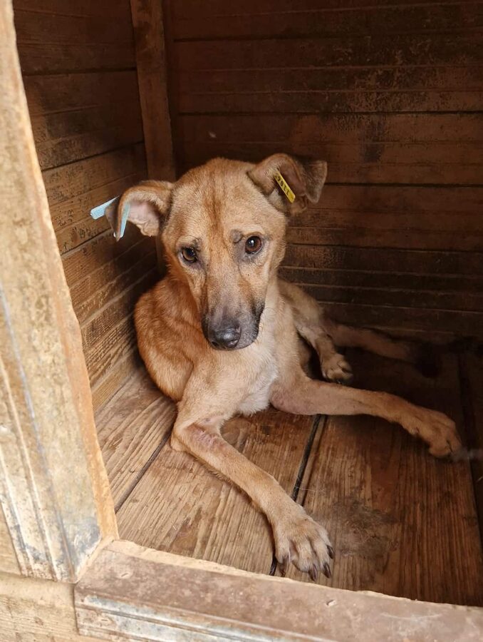Der kleine Kerl FIPSI – er sitzt bereits seit Anfang 2024 in Bucov – kam hinter einer Hütte hervor, als wir im Kennel standen und uns mit den anderen Hunden beschäftigten. Er war völlig abgemagert und kam dort offensichtlich nicht ans Futter. Es ging ihm dort überhaupt nicht gut. Uns gegenüber zeigte er sich recht ängstlich, reagierte eher etwas panisch bei Annäherung, man muss aber dazu sagen, dass er dort in Todesangst lebte und zurückhaltende Hunde dann auch vor Menschen große Angst haben. Wir konnten ihn nicht anfassen, in seiner Todesangst reagierte er bei Bedrängung mit Abschnappen.