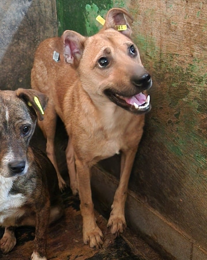 Fipsi hat sich im Vetkennel mittlerweile körperlich als auch seelisch etwas erholt, sodass er etwas mehr auf den Rippen hat und auch vom Wesen her mutiger und interessierter wirkte. Die angebotenen Leckerchen nahm er gerne vom Boden auf, auf unsere Berührungsversuche reagiert er mit Zähne zeigen.