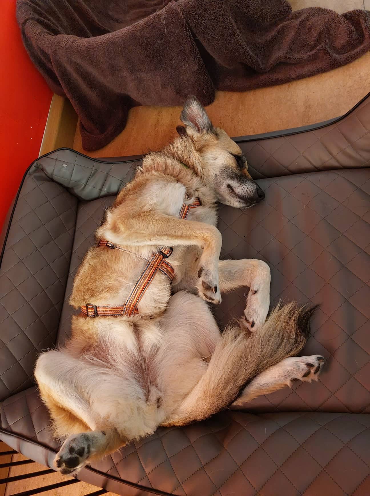Fitzy fährt gut im Auto mit und bleibt in Hundegesellschaft gut alleine.