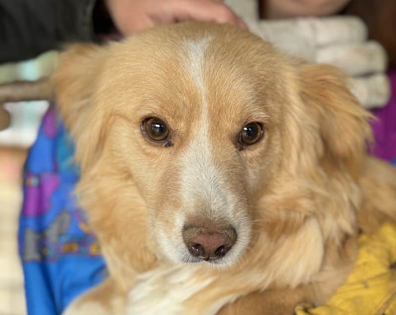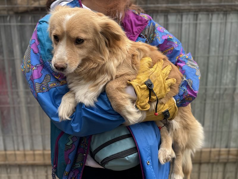 Die kleine, unglaublich hübsche Hündin beeindruckte uns durch ihr Aussehen mit ihrem hellen, rötlichen, längeren, sehr weichen Fell. Schnell ist deutlich geworden, dass sie durch den stressigen Tierheimalltag und dem überfüllten Zwinger wenige ruhige Momente bekommt in denen sie ihre schöne, zarte Seele zeigen kann. Überwältigt durch den menschlichen Besuch in ihrem Zwinger zog sie sich in eine der Hütten zurück. Zunächst war sie sehr eingeschüchtert. Beim Erstkontakt mit einer Handschuhhand, zeigte sie ein halbherziges Angstschnappen, dennoch ließ sie sich nach kurzer Zeit vorsichtig mit der Hand berühren und dann auf den Arm nehmen. Sie wurde immer ruhiger und ließ sich länger streicheln. Es war ungewohnt für sie, aber gleichzeitig schien sie die Ruhe und die Berührung anzunehmen. Was für ein Riesenschritt für diese zarte Dame. Für uns war dieses Verhalten besonders und sehr rührend. Sie wird sicherlich etwas brauchen, um sicherer zu werden. In der Hütte, in der wir sie fanden, lag sie ganz eng an einen anderen Hund gekuschelt, bei dem sie Sicherheit suchte. Hier sind Menschen gesucht, die mit Feingefühl und Erfahrung diesem zarten Hundemädchen eine Chance geben.