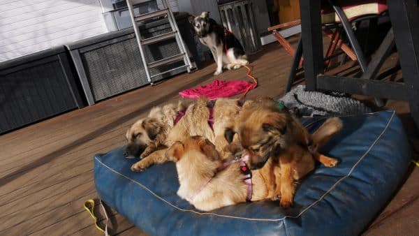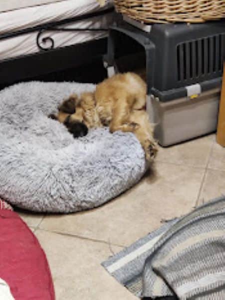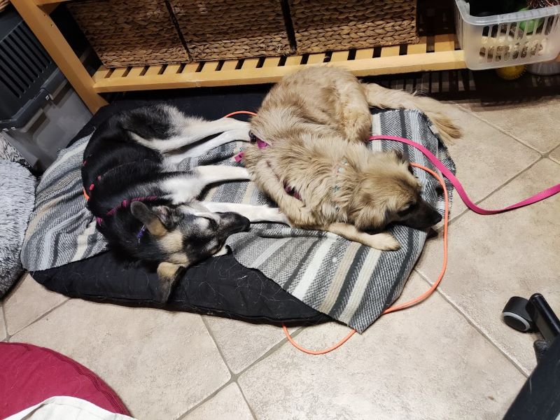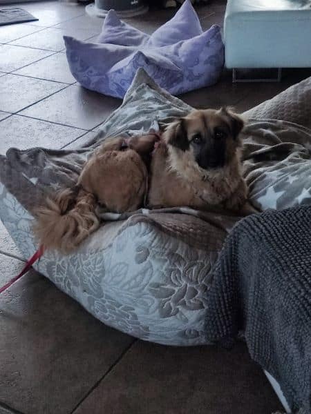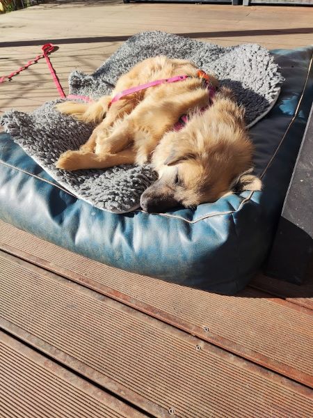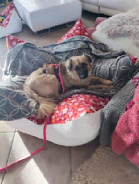 Die hundeerfahrenen Katzen gehören für Floare mit zum Rudel. Sie ist stubenrein, schläft nachts durch, kann eine angemessene Zeit alleine bleiben, macht nichts kaputt, dekoriert nichts um und sie kann gut im Auto mitfahren. Ich kann ihr jederzeit Dinge wieder abnehmen; sie überall anfassen, Krallen schneiden, kämmen. Bett und Sofa sind hier tabu, das wird von ihr akzeptiert. Gekuschelt wird dennoch auf unserem extra dafür bereitgestellten großen HundeMenschKronenKissen