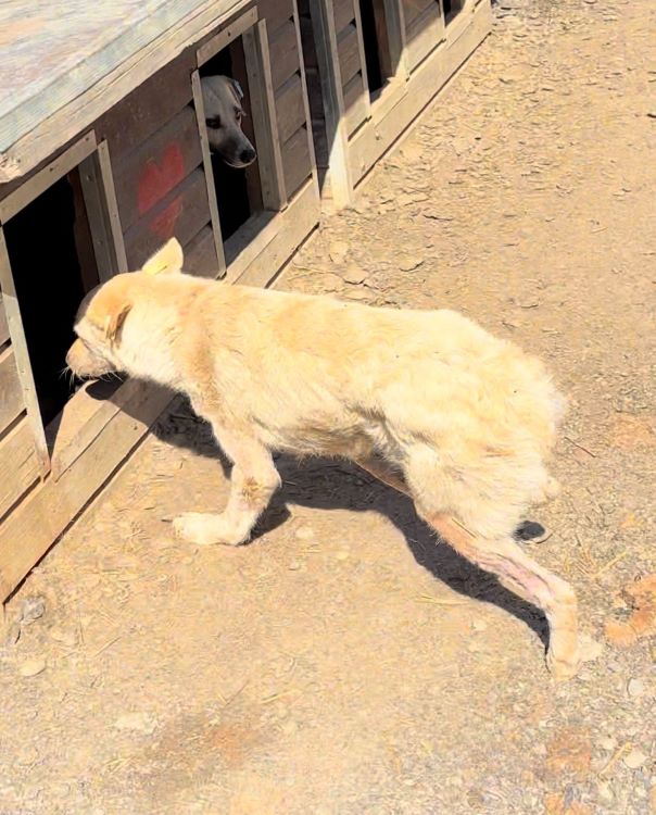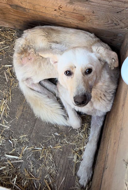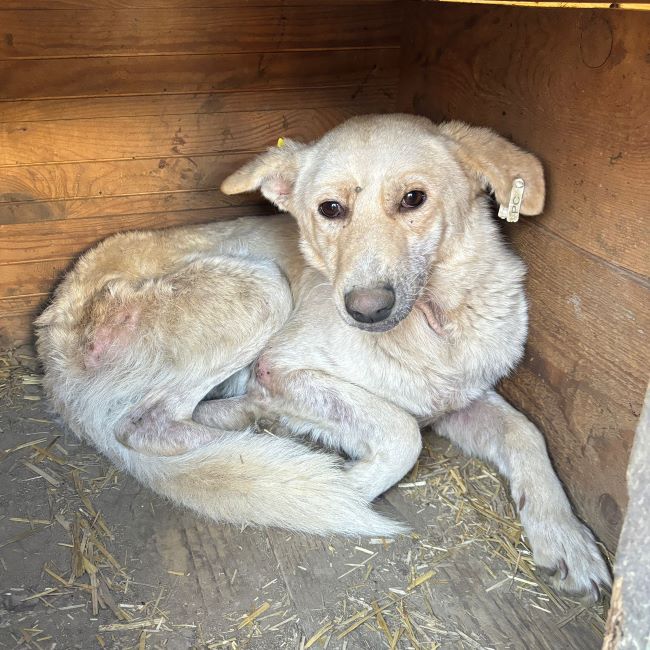 Diese arme Hundeseele ist mit der Situation völlig überfordert. Während unseres Besuchs lag FLOCKE in der Hütte, völlig abgemagert und geplagt von Hautproblemen.