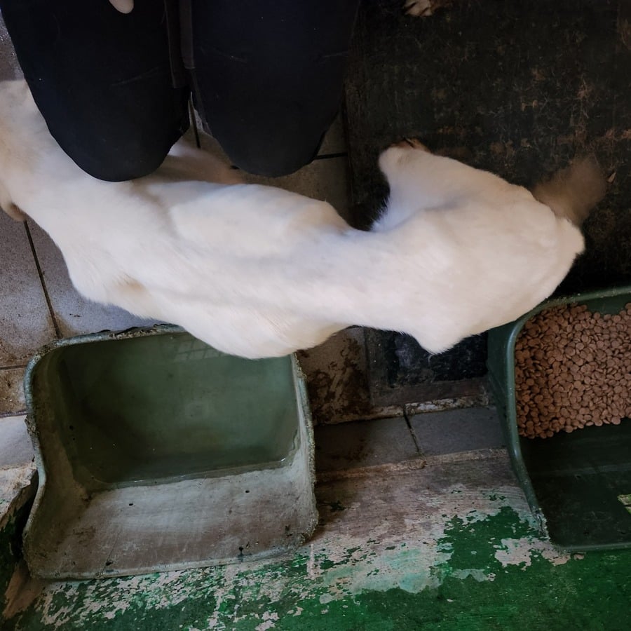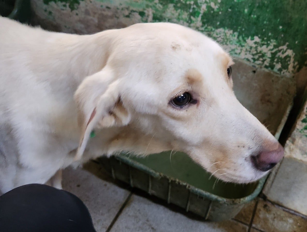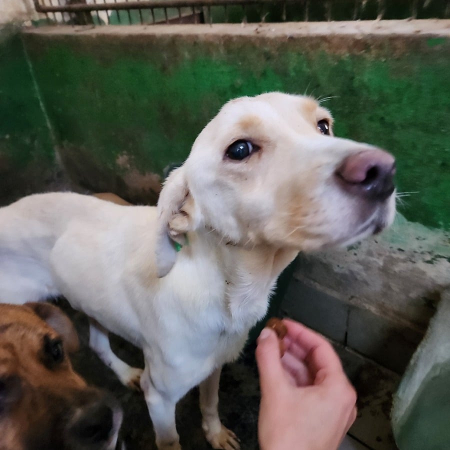 Trotz ihres äußerst beunruhigenden Gesundheitszustands begegnete sie uns ganz zart und nahm die angebotenen Leckerchen vorsichtig aus der Hand und sog die Streicheleinheiten förmlich auf. Ihre Rute wedelte voll Freude über die seltene Nähe und Zuneigung. Eine devote, zarte Hündin die im harten Shelter völlig untergeht.