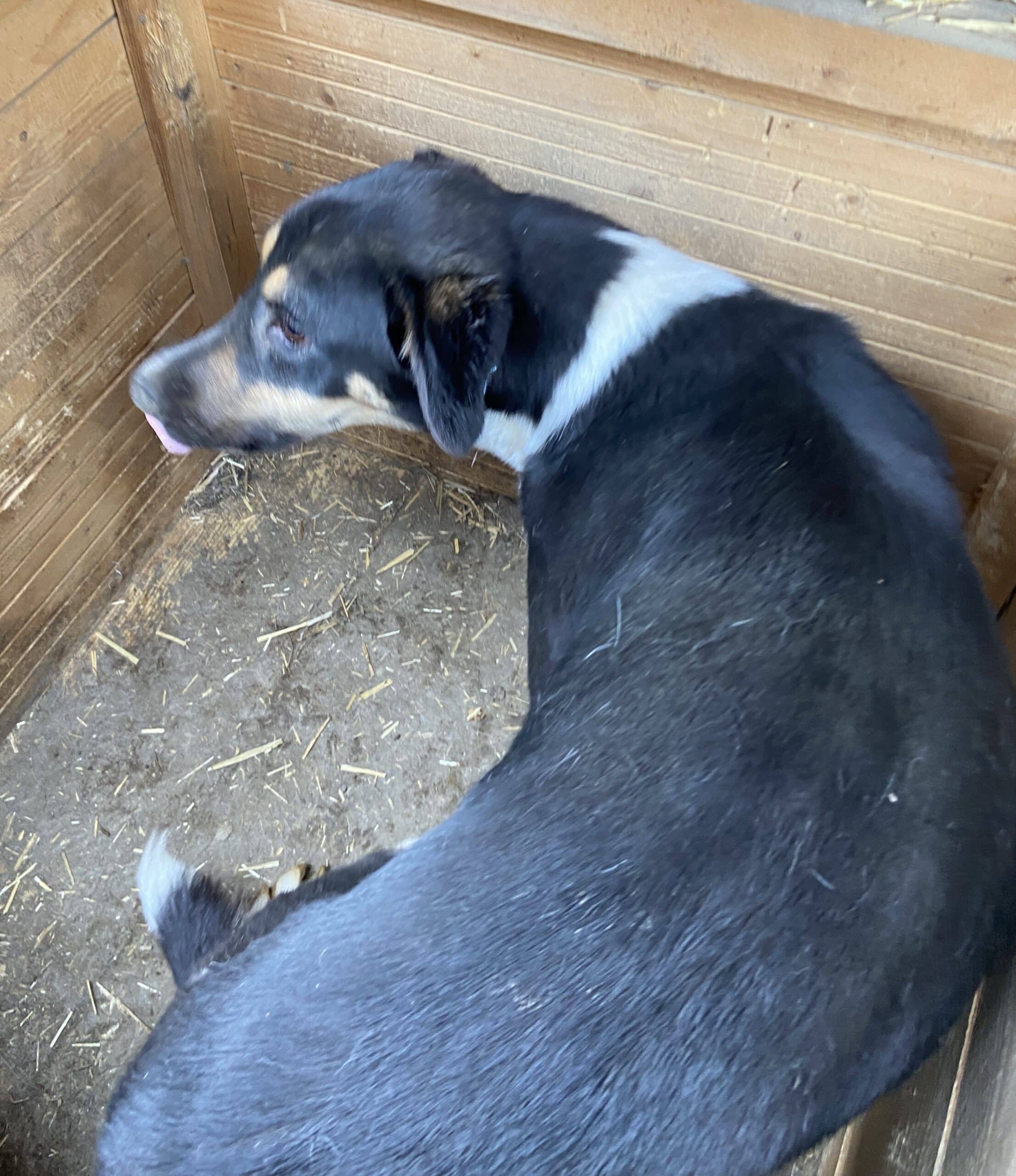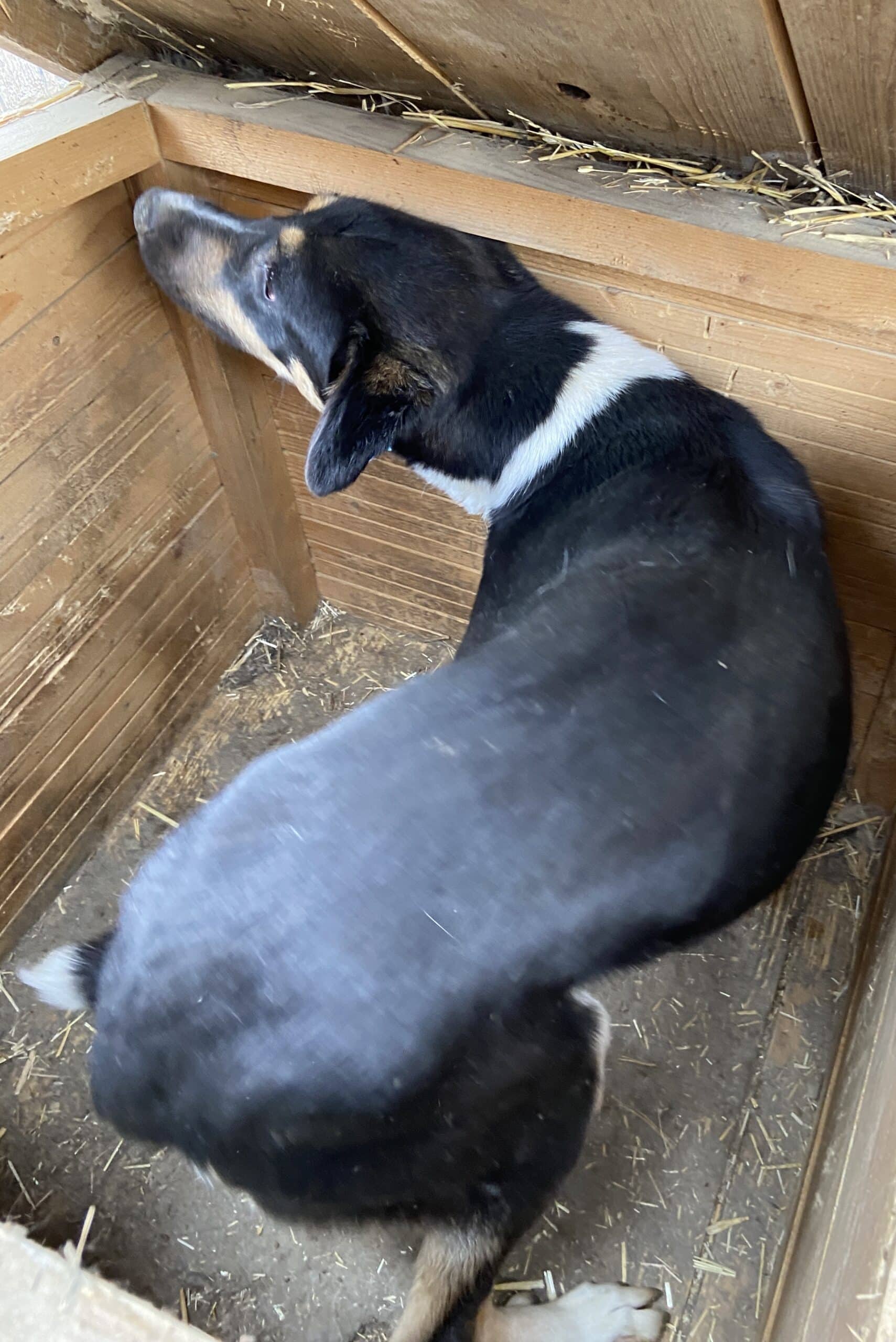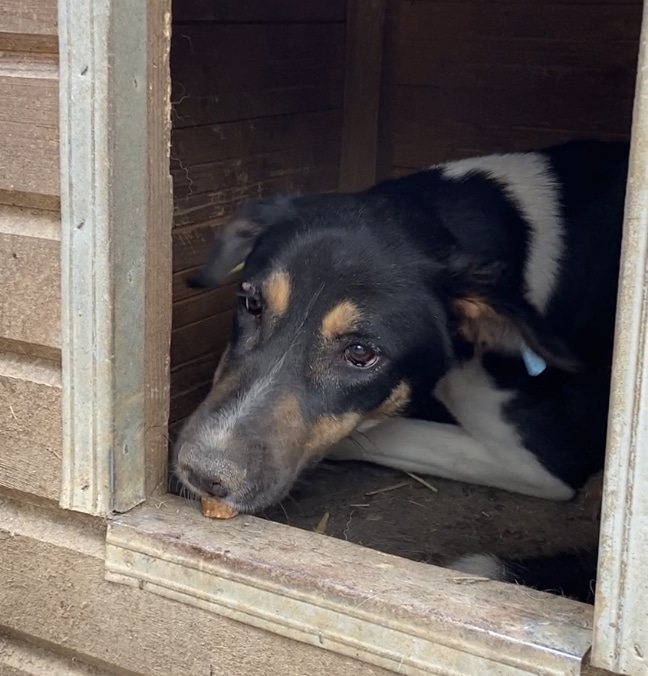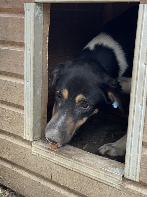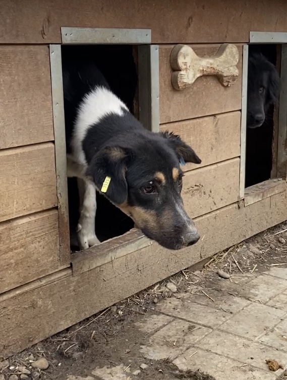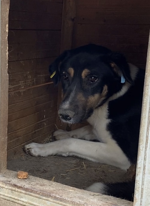 FLORI ist zum Glück nicht mehr zu dünn. Der hübsche junge Rüde zeigte sich bei unserem Besuch leider ängstlich und zurückhaltend. Er zog sich sofort in seine Hütte zurück und wirkte sehr angespannt und überfordert. Trotzdem konnte wir ihn dazu motivieren, unsere Leckerchen wenigstens vom Rand der Hütte zu nehmen. Zu mehr fehlte ihm der Mut, er kann uns Menschen aufgrund des fehlenden Kontakts einfach nicht einschätzen. Als wir die Hütte öffneten, ließ er sich zwar anfassen, konnte dies aber überhaupt genießen und ergriff bei erster Gelegenheit die Flucht. FLORI blieb in jeder Situation defensiv. Mit den anderen Hunden in seinem Kennel wirkt er verträglich. In einem neuen Zuhause würde ihm ein souveräner Ersthund die Eingewöhnung sicher erleichtern.