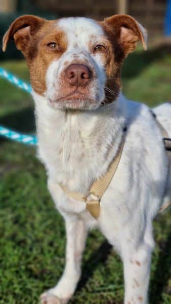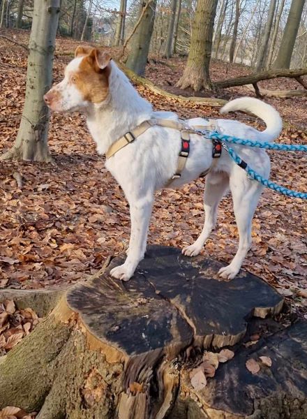 Bei Hundebegegnungen außerhalb neigt er derzeit noch zum Bellen, ist aber stets absolut händelbar. Dies sollte im neuen Zuhause mit Hundeerfahrung schnell vorbei sein.
