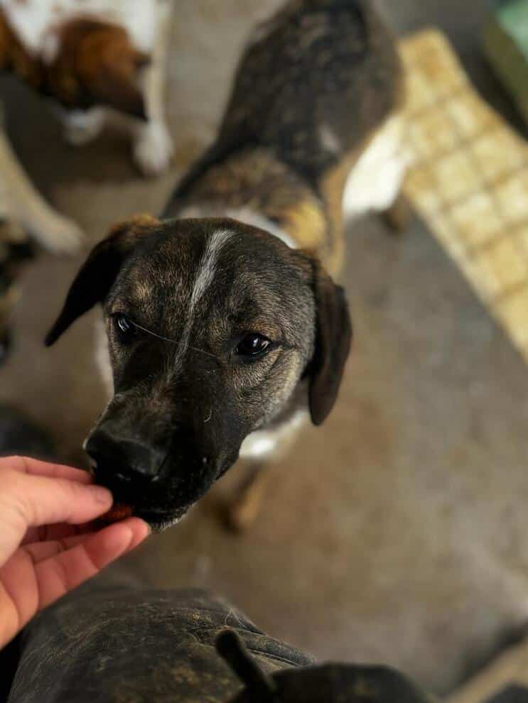Update 03/24: Franek ist ein toller Rüde, der seine Welpenzeit im Shelter hinter Gittern absitzen muss. Da ist die Freude über unseren Besuch und insbesondere über die Leckerchen groß. Franek ist sehr verträglich und verspielt.