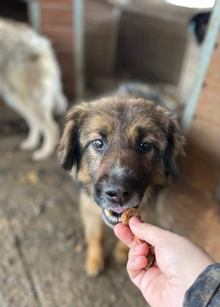FRANKA ist eine liebe und neugierige Hündin. Gern nahm sie unsere Leckerchen und war immer in unserer Nähe. In ihrem Kennel scheint es gut zu funktionieren und bei unserem Besuch haben alle sich ein wenig Mut gefasst, um zu uns zu kommen, so auch FRANKA.