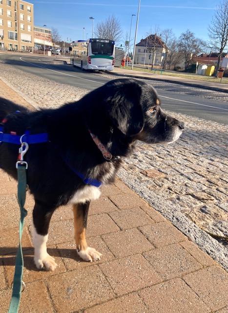 Er kommt auf Pfiff und hört auf seinen Namen. Er spielt gerne (auch mit Ball und Stock), fordert aktiv Streichler und Aufmerksamkeit an, liebt es, an der frischen Luft zu sein und zu spazieren, läuft extrem entspannt an der Leine. Alltagsgeräusche sowie fremde Menschen, Autos, Busse etc. werden schlicht nicht beachtet. Jagdtrieb war bisher nicht zu beobachten. Zu Katzen können wir keine Aussage treffen. Was Frederic sehr gerne tut: essen. Wundert aber nicht weiter, die Sennenhundoptik erklärt den Rest. Autofahren bereitet keine Probleme, er hüpft entspannt in die Box und nach Ankunft wieder raus. Beim Autofahren selbst verhält er sich still. Tierarztbesuche hat er mit Bravour gemeistert, der Check auf Mittelmeerkrankheiten fiel negativ aus. Seine Zähne haben wir röntgen und untersuchen sowie den Zahnstein entfernen lassen: alles bestens. Seine neue Familie kann bei Interesse die Röntgenbilder gerne von unserer Tierärztin erhalten. Diese meinte auch, dass er eher zwei als drei Jahre alt sei, in diesem jungen Alter ist das aber sowieso nebensächlich.