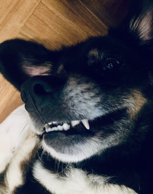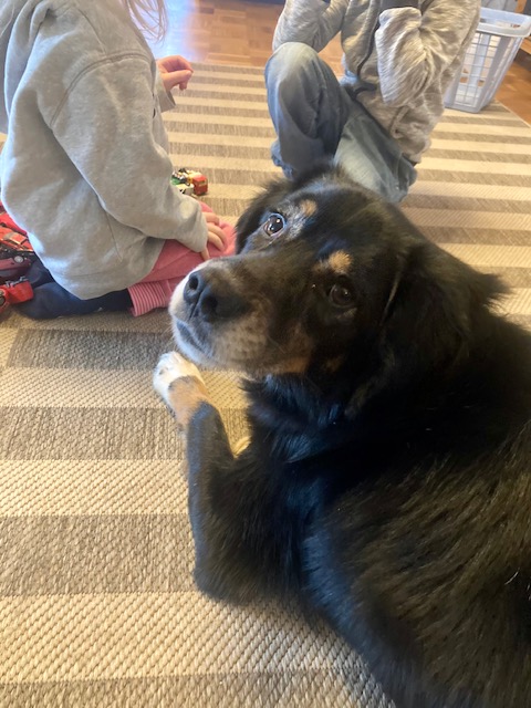 Stubenrein ist er, sollte er außerhalb seiner Zeiten dringen „müssen“, gibt er Laut. Alleine bleiben ist kein Problem, sowohl tagsüber als auch nachts, da schläft er getrennt von der Ersthündin still und friedlich die Nacht im Büro durch und freut sich auch über diesen Rückzugsort und die Ruhe. Morgens hüpft dann immer ein extrem gut gelaunter Frederic aus dem Büro und staunt, warum die Menschenkinder so gar keine gute Laune zu dieser frühen Stunde haben (die Erwachsenen übrigens auch nicht). Ein paar Treppenstufen lief er bisher problemlos, ein kurzer Ausflug in den ersten Stock des Hauses hat er ebenfalls schon geschafft. Interesse an der Couch bzw. darauf zu liegen hat er glücklicherweise nicht. Futterneid gab es bisher nur in einer Situation bei dem ganz besonderen Leckerbissen wie dem Riesenkauknochen. Den wollte er partout nicht wieder hergeben und das hat er auch gezeigt.