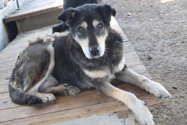 FREDRIKSSON ist ein älterer Rüde, der auf dem Hüttendach lag. Bevor wir den Kennel betraten, verbellte er uns, aber als wir dann drin war, schaute er nur traurig. Vorsichtig nahm er Leckerchen aus der Hand – anfassen ließ er sich nicht. Wir waren im nicht geheuer und er hat entweder schlechte oder wenige Erfahrungen mit Menschen gemacht.