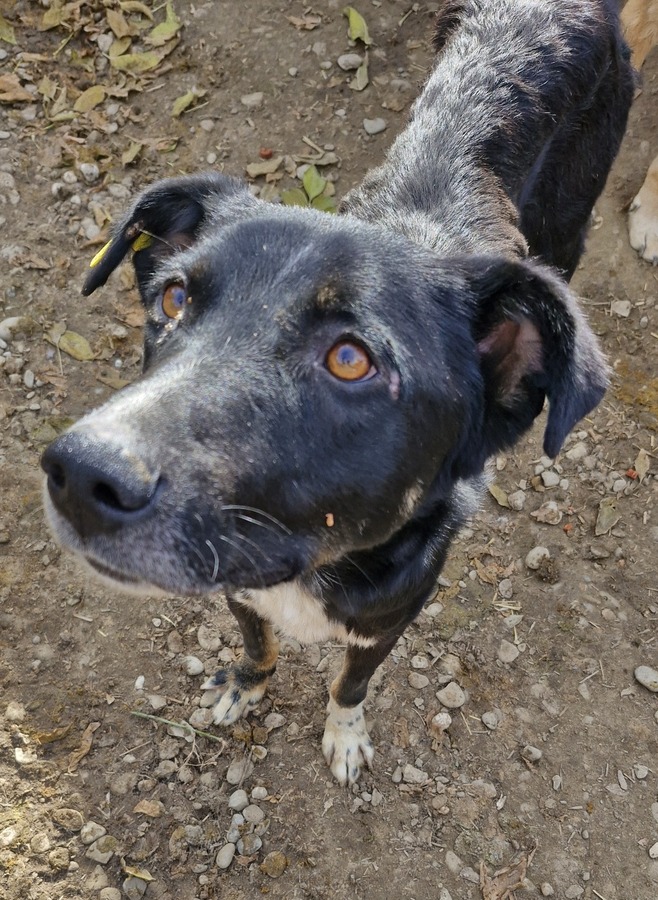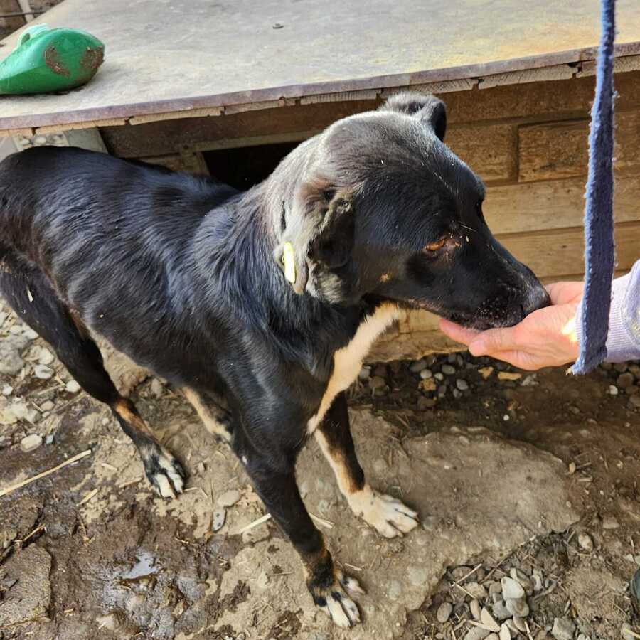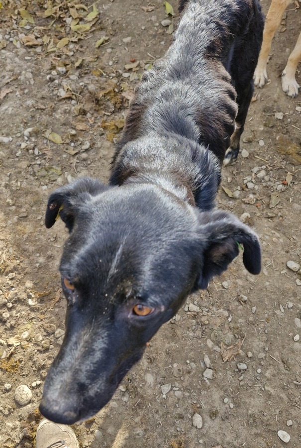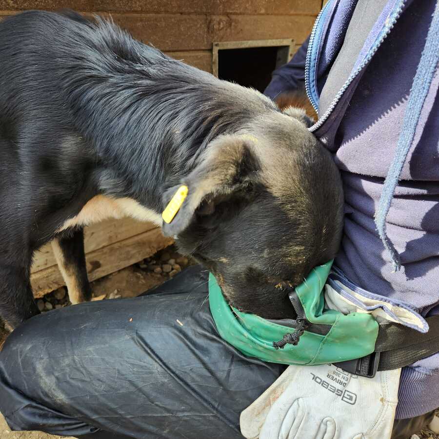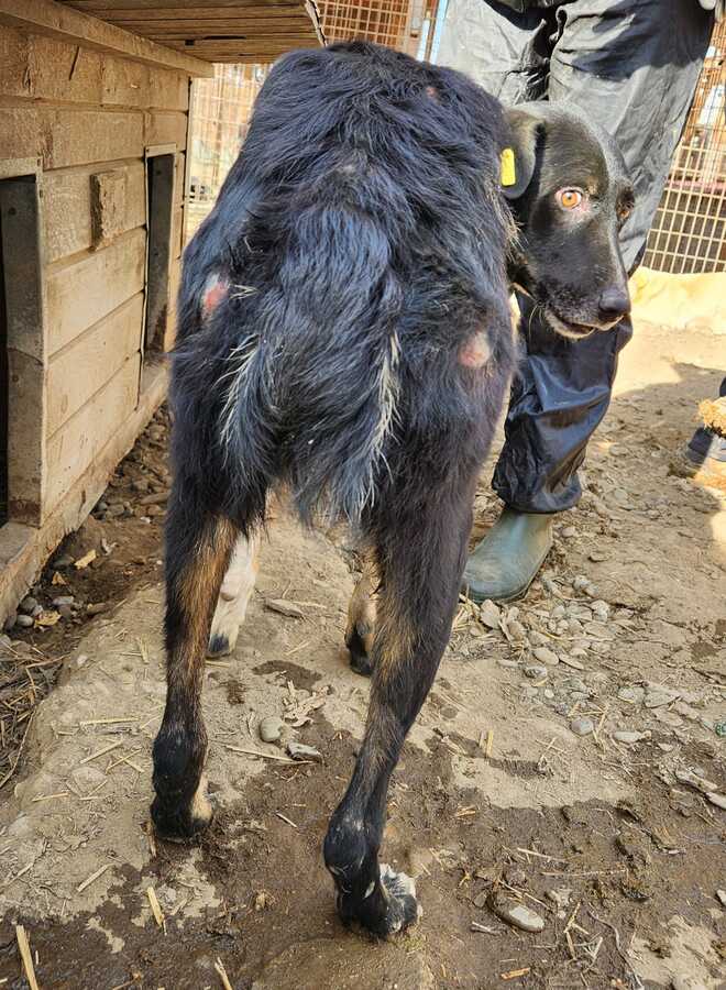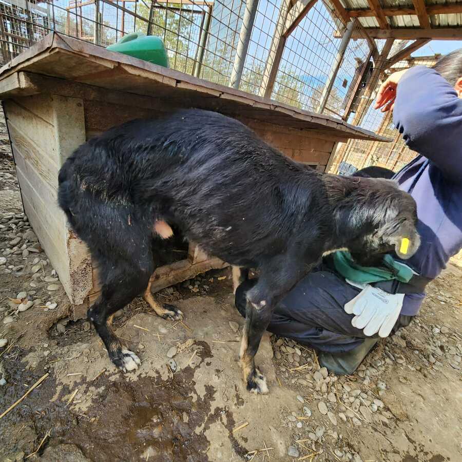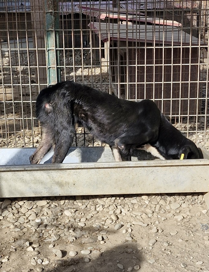 Dieser klapperdürre Rüde nutzte die Gelegenheit sich über das Futter zu stürzen, während wir mit den anderen Hunden im Kennel beschäftigt waren. Als wir das ganze Ausmaß seiner körperlichen Verfassung wahrnahmen, waren wir sehr erschrocken. Im Kennel gibt es einen Rüden, der dominiert und die rangniedrigeren Hunde nicht ans Futter lässt. FRIEDL wird gemobbt und scheint schon längere Zeit nicht mehr gefressen zu haben. Sobald er sich dem Futtertrog nähert, wird er vom Chef im Kennel attackiert und vertrieben. Wir stellten sicher, dass FRIEDL unter unserem Schutz erst einmal in Ruhe fressen konnte. Dabei zeigte er sich lieb, zutraulich und gut anfassbar. Während unseres Arbeitseinsatzes haben wir ihn jeden Tag besucht, wobei er uns schon am Kenneltor freudig begrüßte.