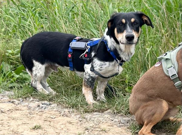 Spaziergänge hat Fritzl von Anfang an super mitgemacht, er kommt direkt in den Flur zum Anziehen, wenn man ihn ruft und läuft super sowohl an der kurzen als auch an der langen Leine. In manchen Situationen reagiert er unterwegs noch schreckhaft, lässt sich dabei aber immer sehr gut händeln. Wichtig ist hier, dass er immer gut gesichert ist durch eine Leine, die am Körper befestigt ist und am besten einen Tracker für den Notfall. Hier macht er aber bereits viele Fortschritte und die Spaziergänge sind meistens sehr entspannt mit ihm. Jagdtrieb hat er bisher nicht gezeigt, andere Hunde auf Spaziergängen findet er interessant, bleibt dabei aber immer unterwürfig und geht jedem Streit aus dem Weg.