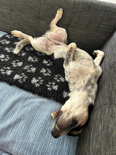 Fritzl macht jeden Tag Fortschritte und springt jeden Tag ein bisschen weiter über seinen Schatten, wir sind uns ganz sicher, dass das Eis bald komplett gebrochen ist und die Fröhlichkeit dann komplett durchkommt, die wir immer wieder kurz aufleuchten sehen bei Spaziergängen, beim Flitzen durch den Garten oder wenn er auf der Couch schnarcht. Es wäre toll für ihn, schon jetzt seine (hundeerfahrenen) Menschen zu finden, bei denen er weiter auftauen darf. Diese werden in ihm auf jeden Fall einen zuckersüßen, treuen und wahnsinnig lieben Freund fürs Leben finden.