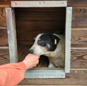 Die hübsche GABRIELLE freute sich über unseren Besuch. Gerne nahm sie unsere Leckerchen aus der Hand. Dabei brachte sie jedes einzelne Leckerchen in ihre sichere Hütte, um es zu essen, was uns sehr berührt hat. Sind unsere Leckerchen doch eigentlich normales Trockenfutter. Aber GABRIELLE fand diese Abwechslung einfach zu gut. Streicheln konnten wir sie nicht. Dafür fehlte ihr der Mut. In einer anderen Umgebung sollte dieser letzte Schritt des fehlenden Vertrauens bald überwunden werden.