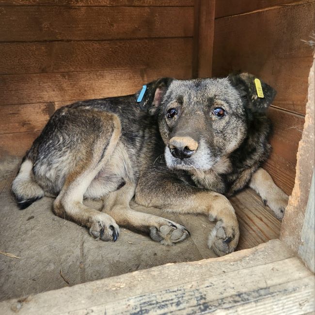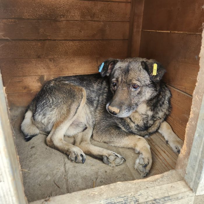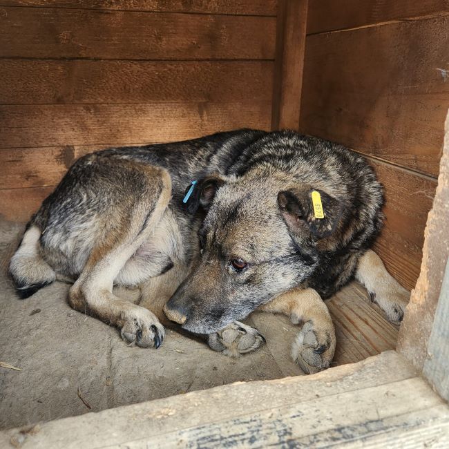 GARY lag die ganze Zeit über recht entspannt in der Hütte, was vermutlich an den warmen Temperaturen zum Zeitpunkt unseres Besuchs lag. Die angebotenen Leckerchen nahm er gerne vom Boden aus an, als wir versuchten ihn zu berühren, war ihm das dann aber doch zuviel der Nähe, sodass er versuchte der Situation zu entgehen. Mit etwas Geduld würde er es aber bestimmt lernen etwas mehr Kontakt zuzulassen.
