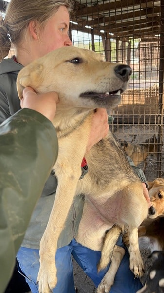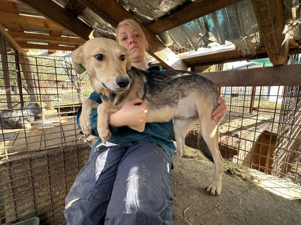 Die junge Hündin war sichtlich überwältigt von unserem Besuch. Anscheinend hatte sie bisher wenig Kontakt zu Menschen. Trotz ihrer Unsicherheit konnten wir sie auf den Arm nehmen. Sie erstarrt bei Streicheleinheiten und kann diese noch nicht genießen. Sie sollte dringend in ein erfahrenes Zuhause ausreisen. Ein souveräner Ersthund würde ihr da sicherlich helfen. Wer rettet die süße Fellnase bevor sie ihr Leben für immer in Bucov verbringen muss?