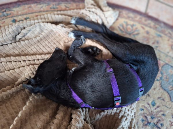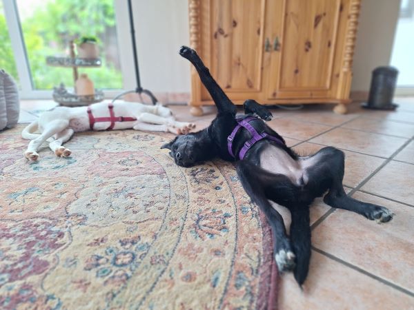 Gefüttert wird sie gemeinsam mit dem anderen Pflegi, aber getrennt von meinen eigenen Hunden, da die „Tischmanieren“ noch etwas rau sind, aber mit deutlicher Tendenz zur Besserung. Autofahrten als gesicherte Beifahrerin auf der Rückbank sind kein Problem. Ihre Stubenreinheit ist über mehrere Tage 100 % und dann gibt es doch wieder 2-3 Tage mit Rückschlägen. Das Alleinbleiben im Rudel ist kein Problem … aber ohne deren Rückhalt, laufen ziemlich schnell auch lautstark die Tränen. Es sind keinerlei Schäden an meiner Einrichtung zu verzeichnen, obwohl nicht ständig Kaumaterialien zur Verfügung stehen (aufgrund evtl. Ressourcenverteidigung im Rudel). Wenn nötig, lässt sie sich jederzeit alles wieder wegnehmen, auch wenn ihr kleines Herz in dem Moment doll daran hängt. Über evtl. Jagdtrieb kann ich bisher keine Angaben machen. Direkten Katzenkontakt gab es bisher noch nicht.