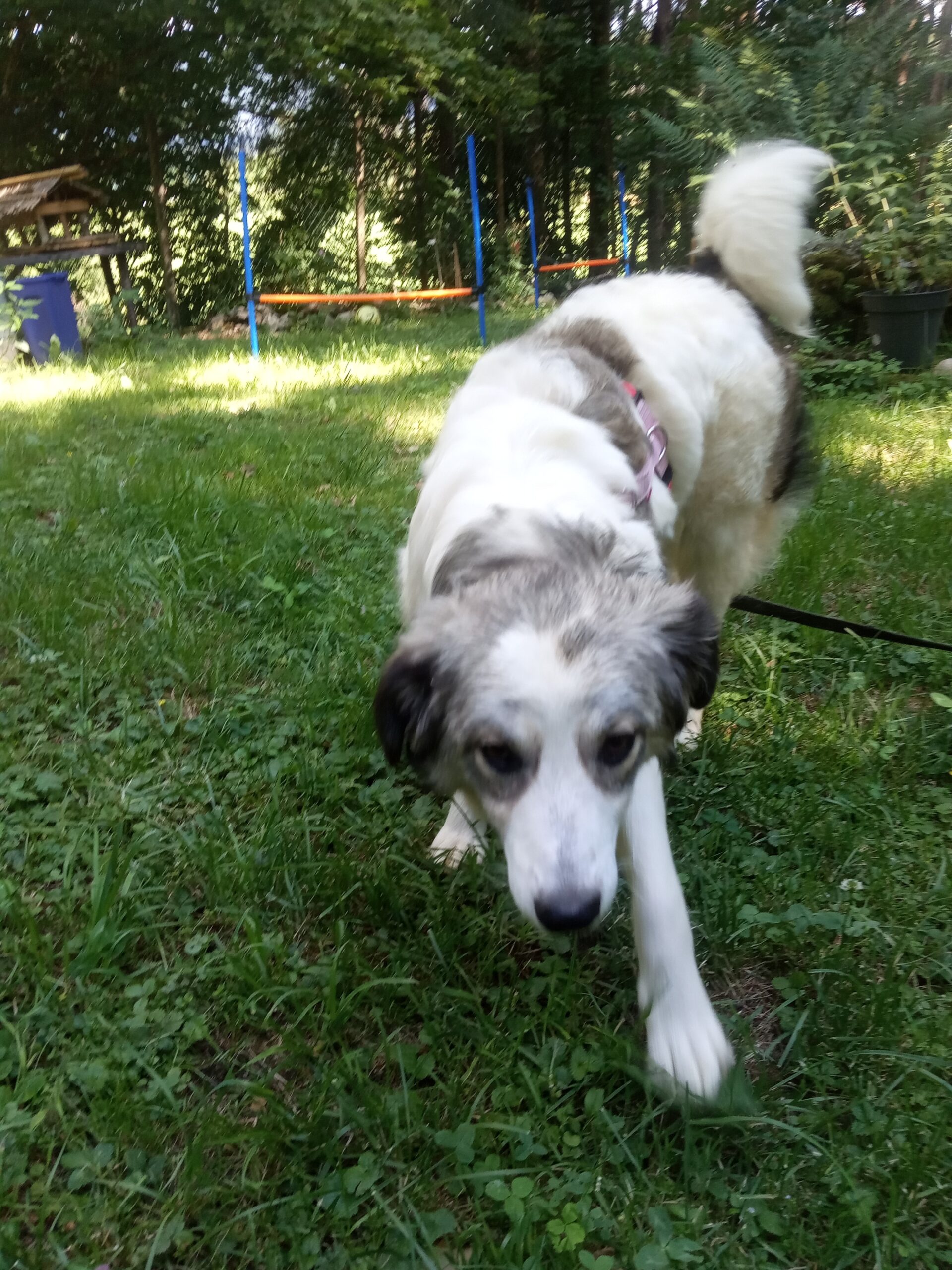 Sie war vom ersten Tag an stubenrein und läuft super an der Leine. Klar gibt es unterwegs Plätzchen die unbedingt beschnüffelt werden müssen und daher wechselt man noch oft die Seiten. Radfahrer und Jogger werden noch mit etwas Abstand beobachtet.