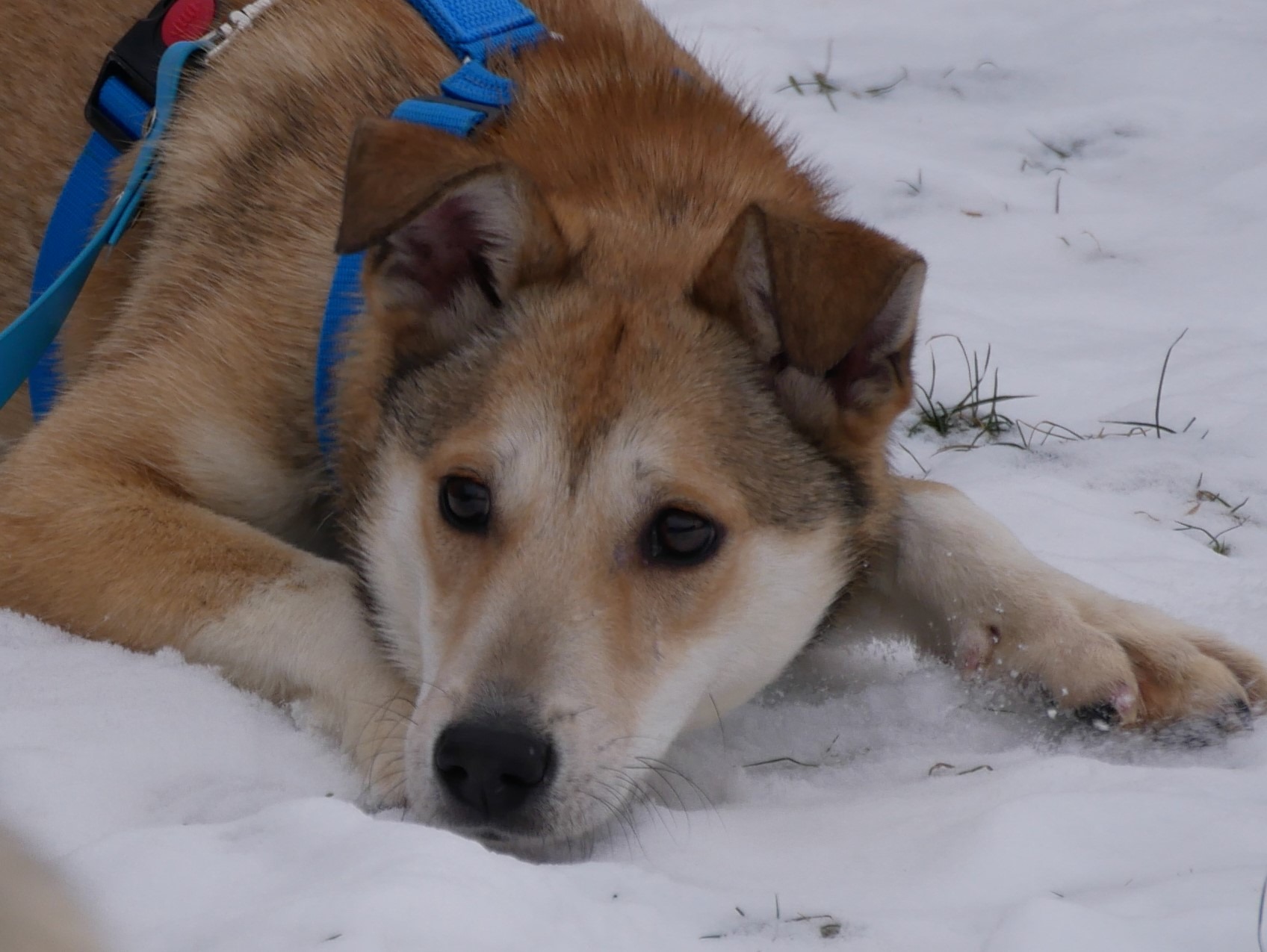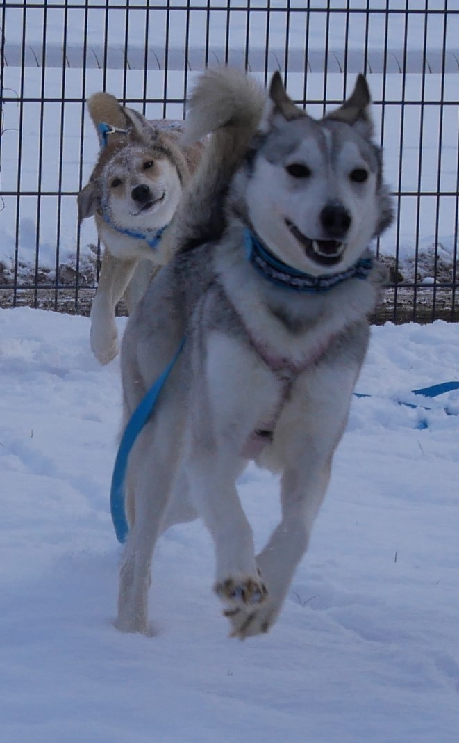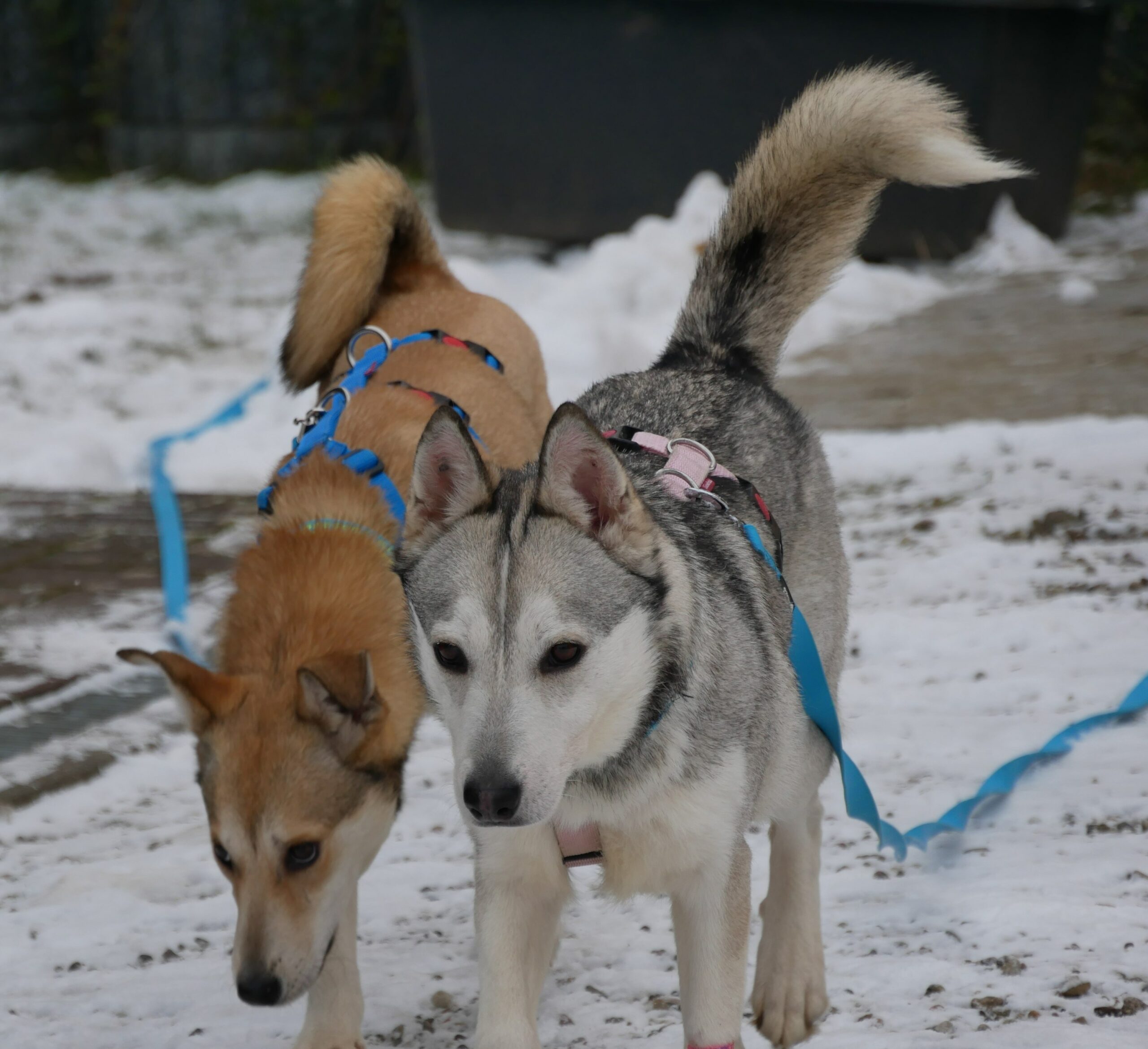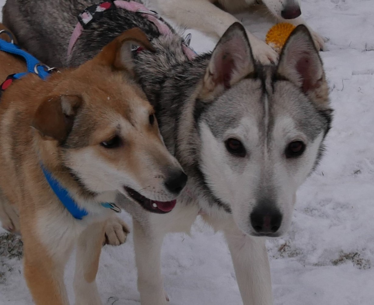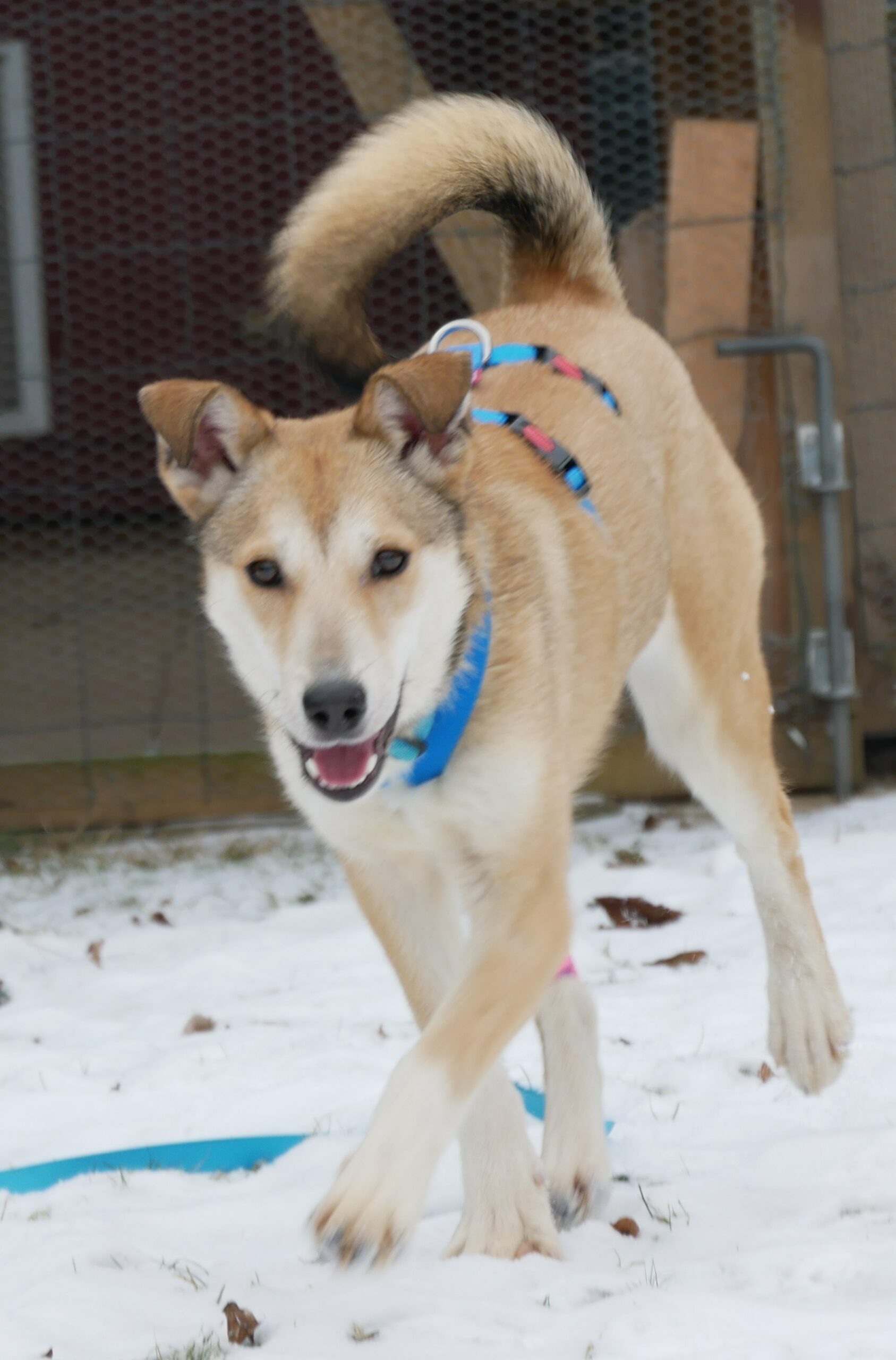 JELLA hingegen ist ein sehr scheues Mädchen, das sich immer hinter ihrer Mama versteckt. Nur bei ihr fühlt sie sich sicher; nur mit ihr schafft sie es überhaupt, sich zu bewegen. Inzwischen konnten wir ihr ein Geschirr anziehen und haben so die Möglichkeit, Kontakt zu ihr aufzunehmen. Sie ist nicht böse, sie hat nur einfach außer ihrer Mama nichts und schon gar nichts positives erleben dürfen. Zusammen auf Pflegestelle geht es den beiden jetzt gut; Glacy ist froh endlich raus zu können, ist aufmerksam, geht sehr gerne und neugierig Gassi. Jella ist wie ein kleines Fohlen und läuft auf dem gesicherten Grundstück frei (an der freien Schleppleine) umher und freut sich ihres Lebens. Es ist so schön zu sehen, wie diese kleine ängstliche Seele gerade jetzt den Schnee, die Tannen, die Erde, die (fast) Freiheit genießen kann.