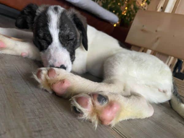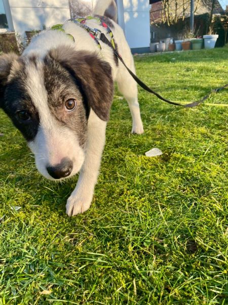 Kurz vor Weihachten 2024 kam Glöckchen auf ihrer Pflegestelle bei uns an. Sie lebt hier gemeinsam mit zwei Erwachsenen, drei Kindern und drei weiteren Hunden. Vom ersten Moment an war sie unerschrocken, offen und freundlich, auch Fremden gegenüber.