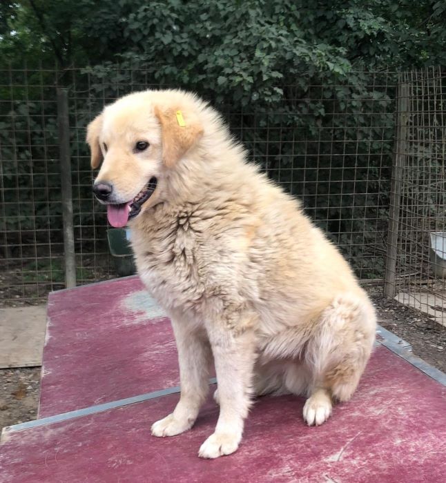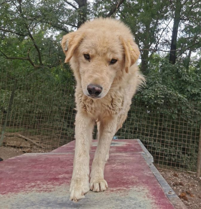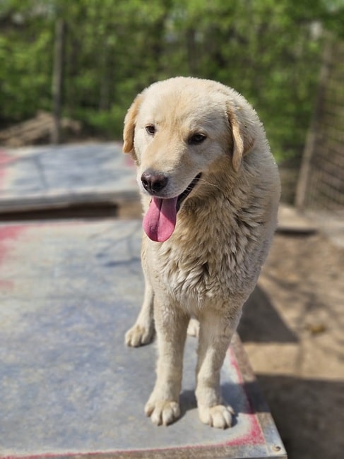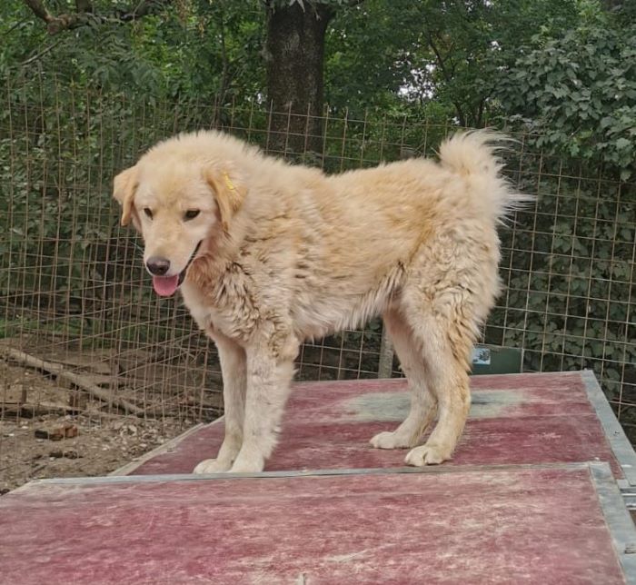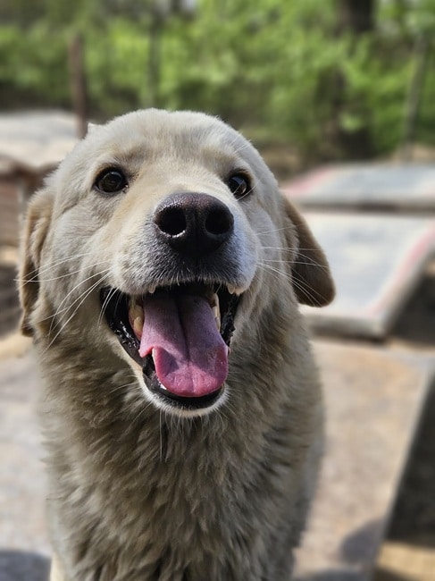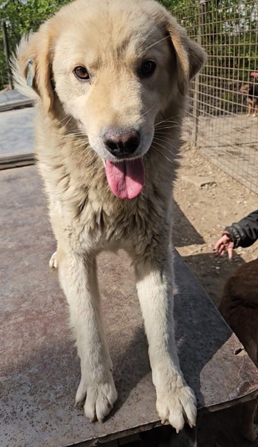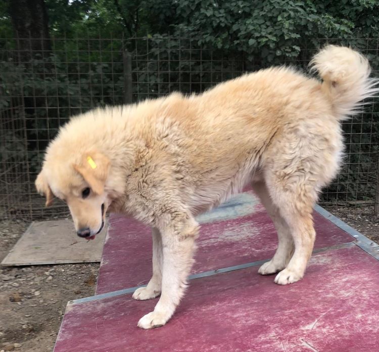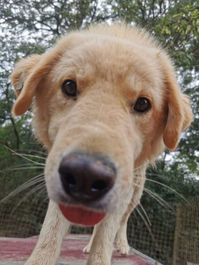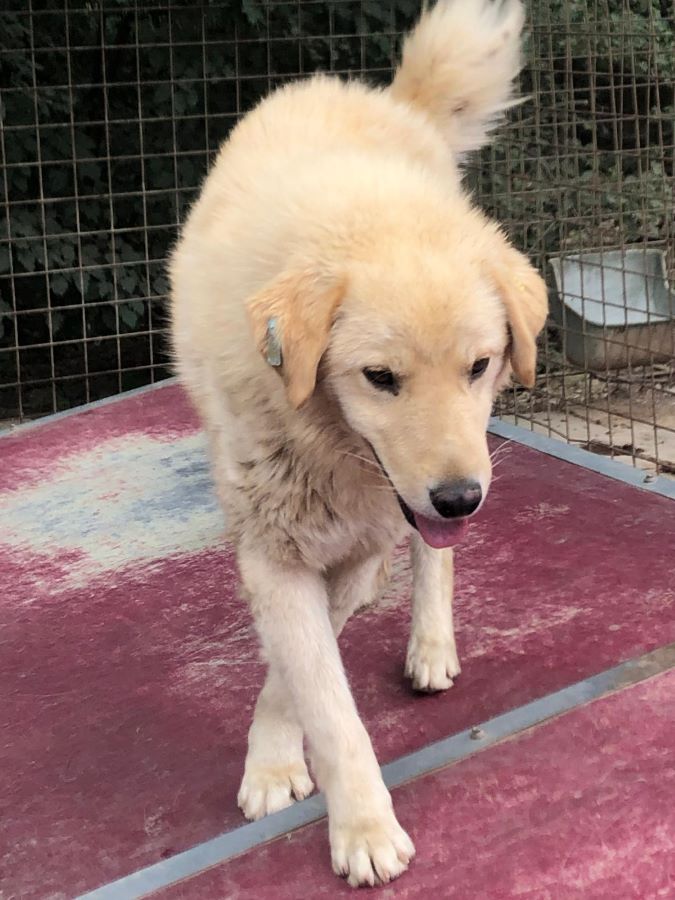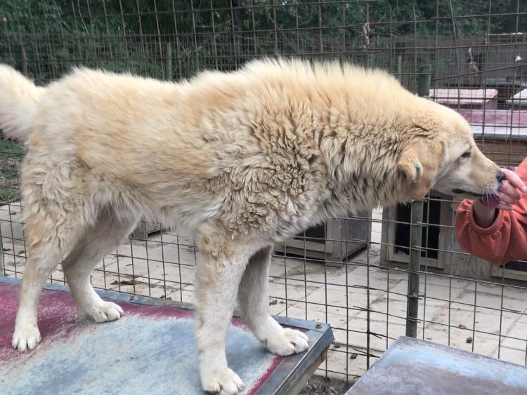 Der süße GOMEZ sieht aus wie ein Plüschteddy. Er freute sich sehr über unseren Besuch. GOMEZ lebt quasi auf den Hüttendächern und hat dort, vor dem Gewusel der anderen Junghunde, einen Rückzugsort. Als wir uns ihm zuwandten, nahm er gerne unsere Leckerchen und wir konnten ihn dabei an der Schnauze berühren. Wahrscheinlich hat er Streicheleinheiten nie kennengelernt und so überspielte er seine Unsicherheit mit Spielaufforderungen. In einer anderen Umgebung würde dieser letzte Schritt des fehlenden Vertrauens schnell überwinden sein. Seine offene, neugierige Art werden ihm dabei helfen.