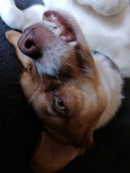 Ihre Unsicherheit zeigt sich indem sie sich ganz schnell um die eigene Achse dreht. Dabei versucht sie sich selbst zu verletzen indem sie sich ins Hinterbein oder die Rute beißt. Ebenso leckt und knabbert sich Leslie bei Stress ihre Rute wund und blutig. Dieses Verhalten tritt auch spontan, ohne ersichtlichen Grund auf.