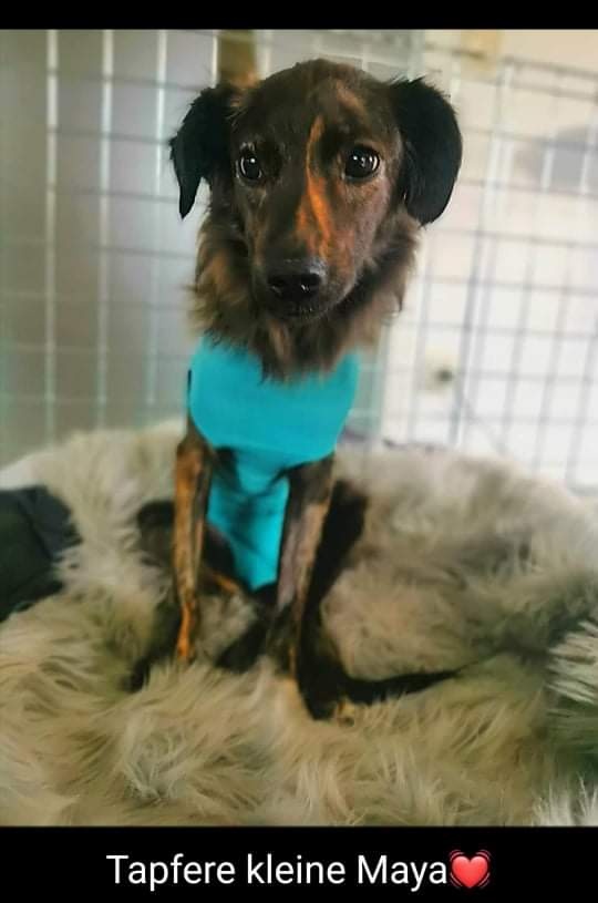 Die junge Hündin ist unglaublich freundlich, genießt es im Garten zu liegen und mit den anderen Hunden zu spielen. Einen Monat konnte sie ihr Leben in Deutschland in vollen Zügen genießen, bis sie krank wurde. Es sah alles nach einem normalen Infekt aus – Fieber, keinen Appetit, Übelkeit. Doch das Antibiotika vom Hausarzt wirkte nicht. Deswegen musste die kleine Maya dringend in die Klinik: Das Zwerchfell von Maya ist beim Unfall in Rumänien vermutlich angerissen und im Laufe der Zeit immer mehr gerissen, wodurch es ihren Darm und weitere Organe verschoben hatte, die Leber wurde von anderen Organen stark gedrückt, weswegen sie die erhöhten Leberwerte hatte. Die Not-OP stand also an. Die OP hat die kleine Maya gut überstanden, wird sich aber noch einer weiteren OP an den Beinen stellen müssen.