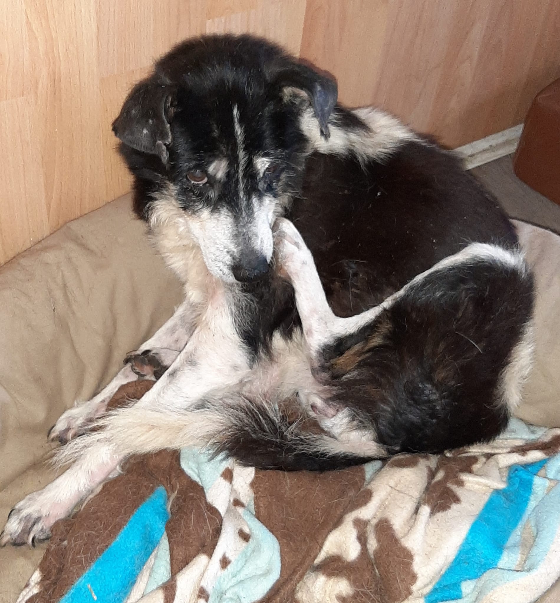 Ihr ganzer Körper ist versteift, was wir u.a. der diagnostizierten Hepatozoonose zuschreiben. Sie kann ihren Kopf durch den steifen Nacken nicht richtig heben und hat starke Probleme beim Laufen. Da sie auch einen sehr hohen Babesien-Titer hat, wird sie mit Carbesia behandelt, und wir hoffen, dass sich das auch positiv auf die Hepatozoonose-Begleiterscheinungen auswirkt. Zudem kam sie mit starken Hautproblemen und abgemagert auf ihrer Gnadenplatzpflegestelle an. Sie scheint auch nicht mehr gut zu hören.