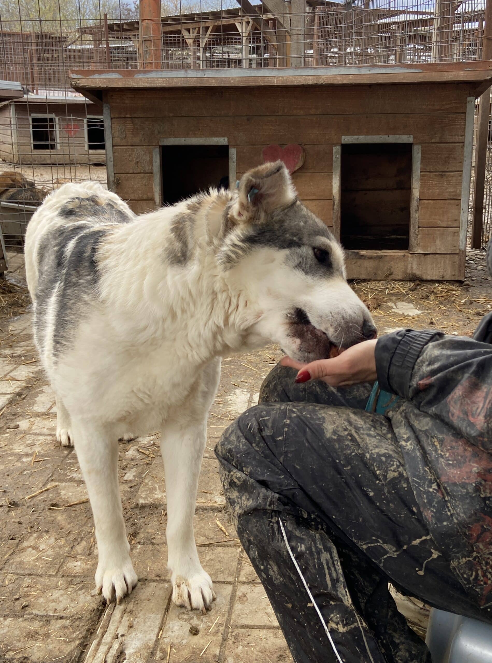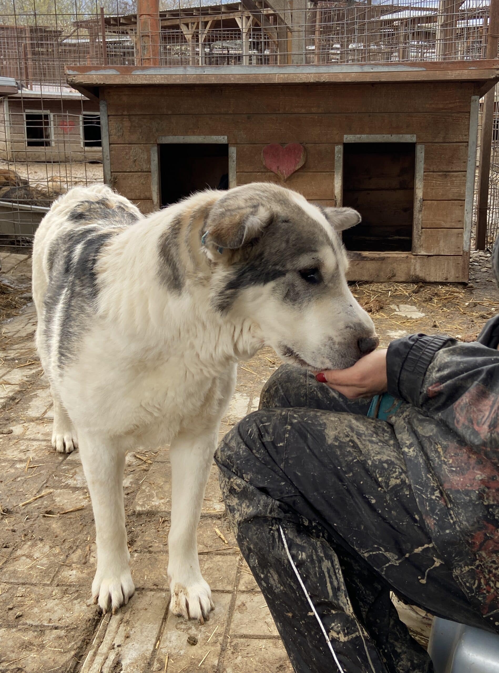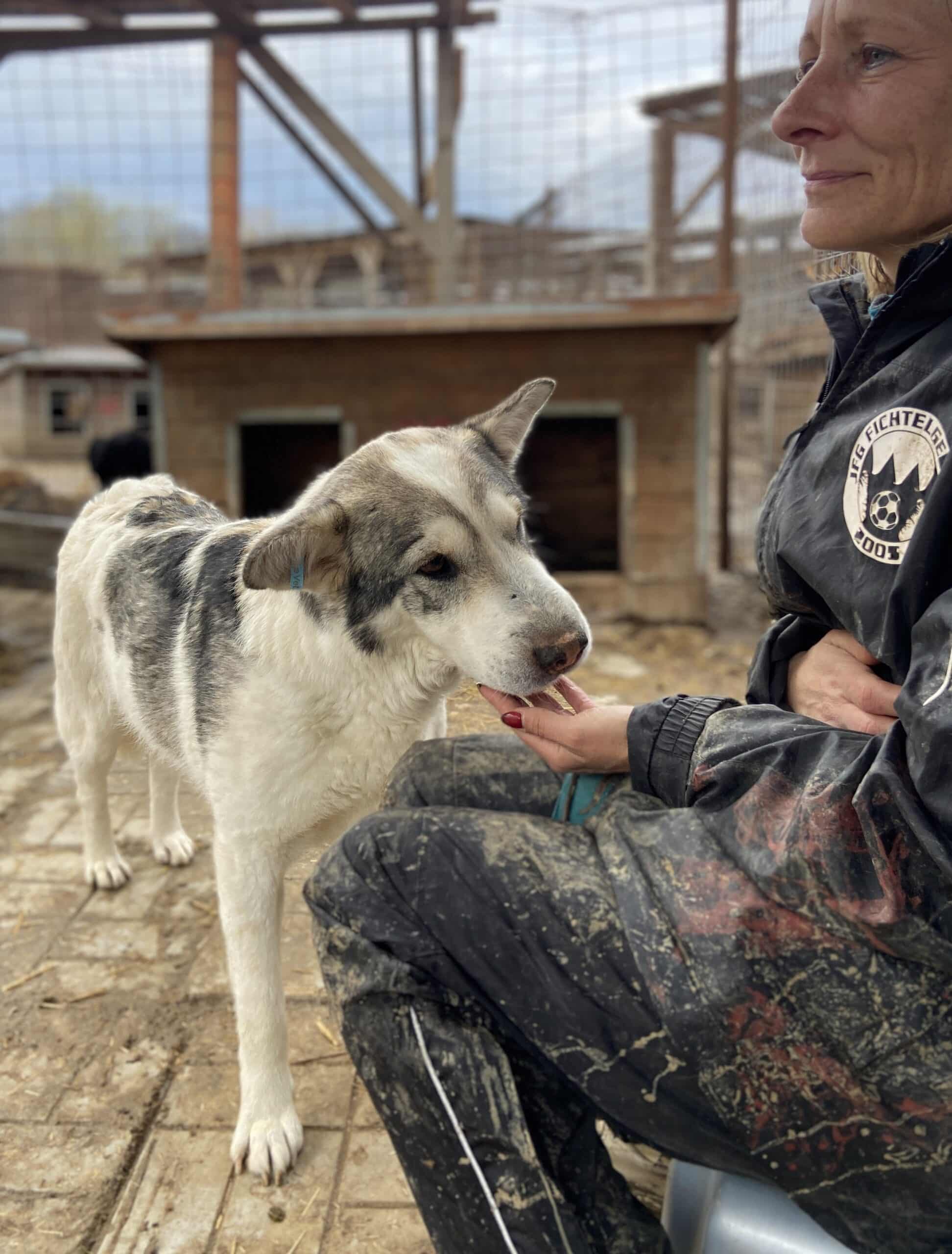 GRISCHA beobachtete uns schon von Weiten an seinem Kenneltor und hoffte, dass auch er etwas Aufmerksamkeit erhaschen darf. Er freute sich sehr, als wir seinen Kennel betraten, und nahm weiterhin Leckerchen aus der Hand, für mehr fehlt ihm der Mut. GRISCHA ist dankbar über jede Sekunde der Aufmerksamkeit und würde sich so gern mehr trauen…