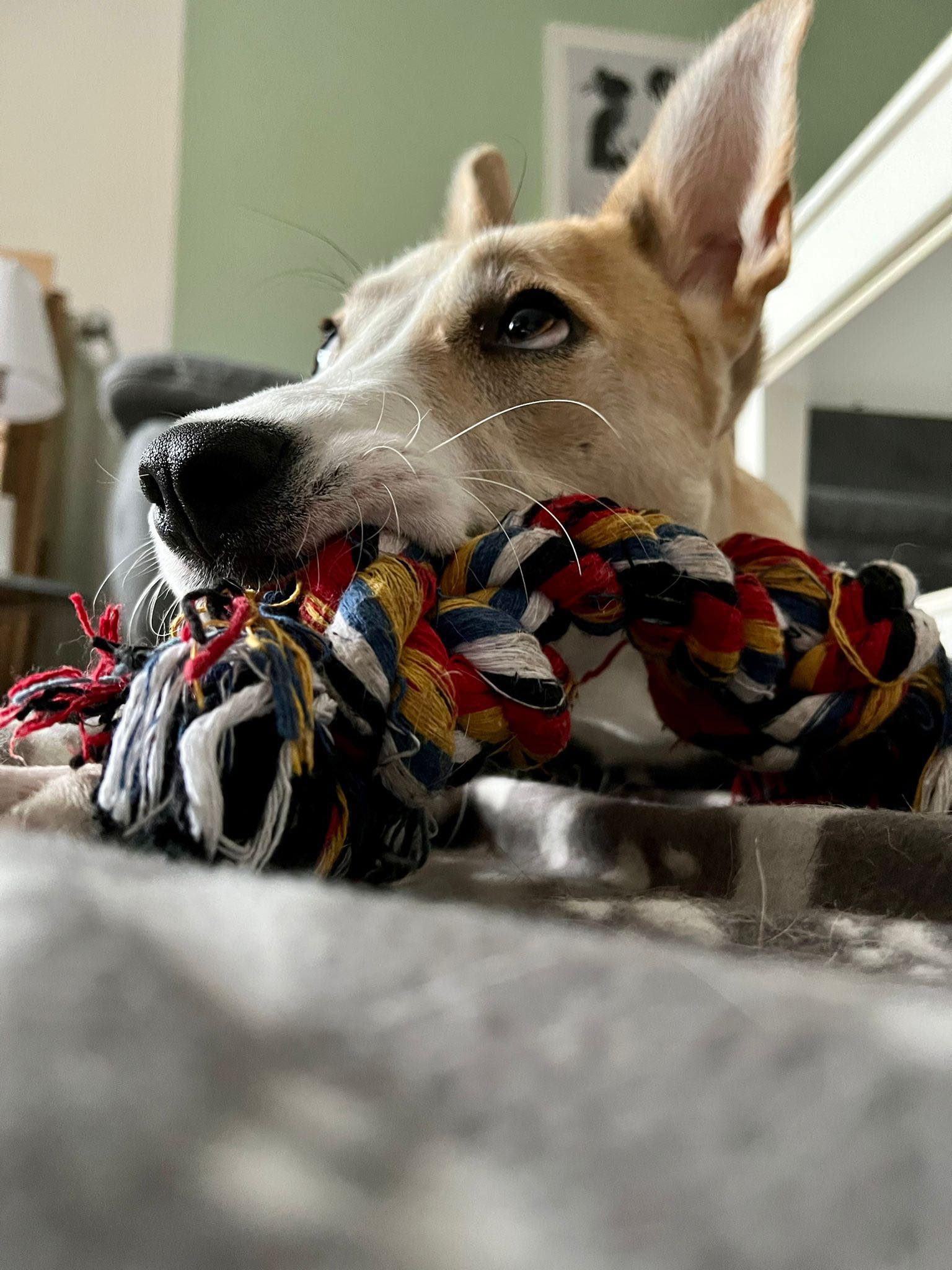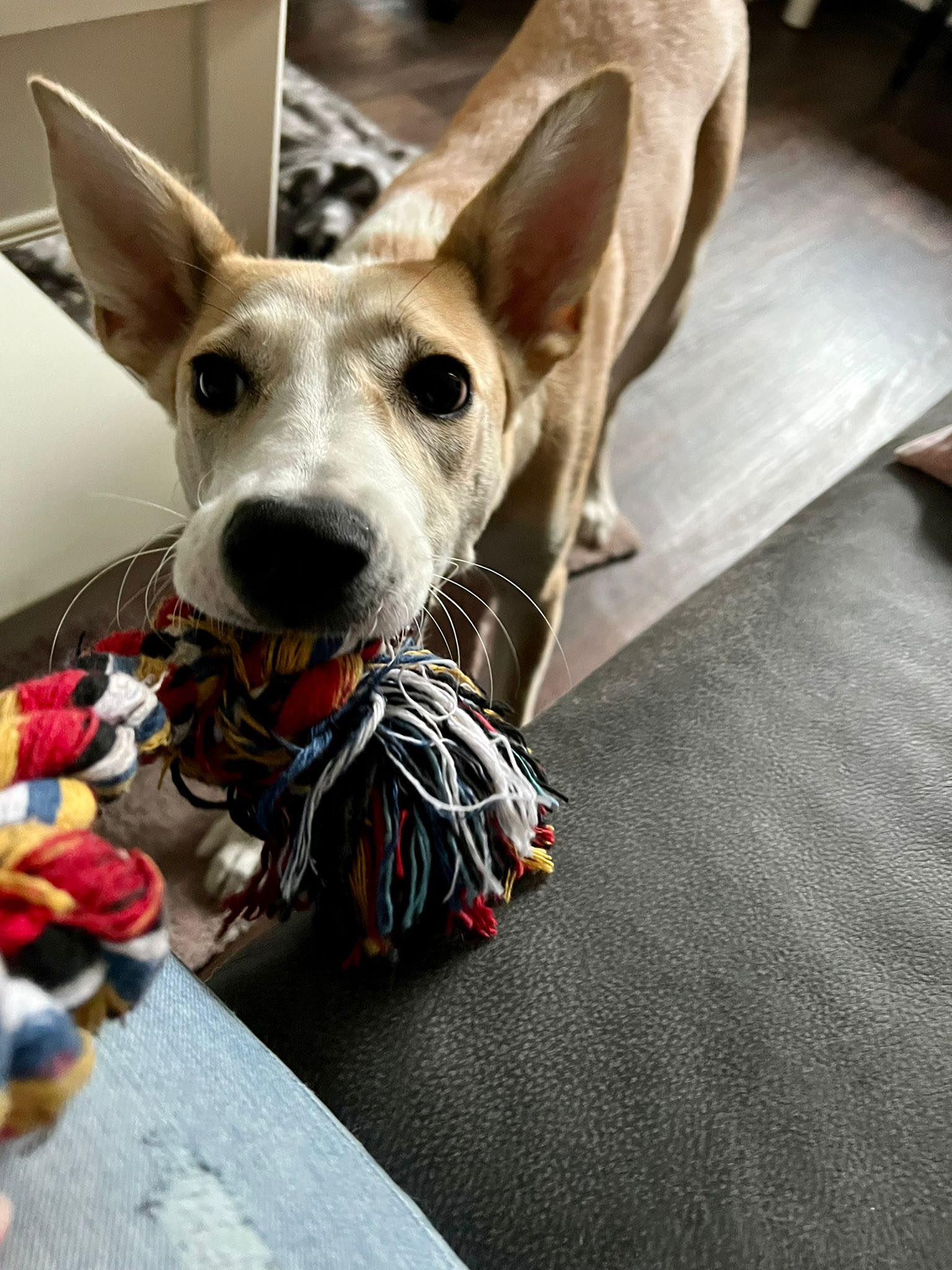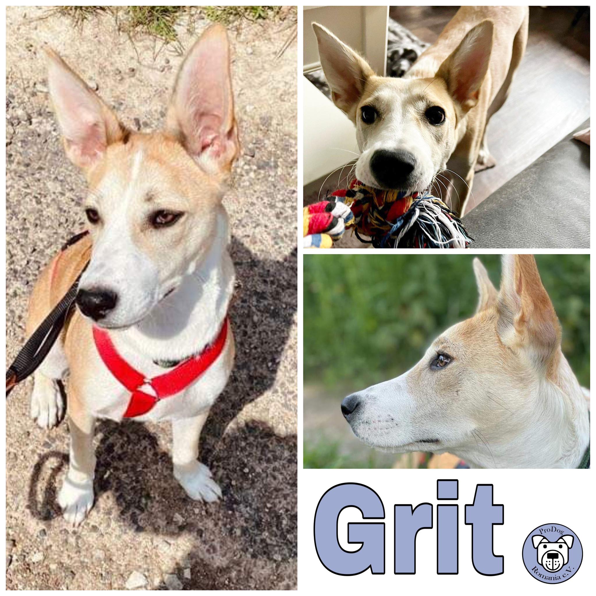 Die kleine Grit ist seit Mitte März 2022 bei uns auf Pflegestelle und ist sehr neugierig, mutig und junghundtypisch verspielt. Sie hat phasenweise viel Energie und liebt es zu mit ihrem Spielzeug zu spielen. Auch Pantoffeln und Schuhe findet sie klasse und trägt sie immer ganz stolz zu ihrem Schlafplatz.