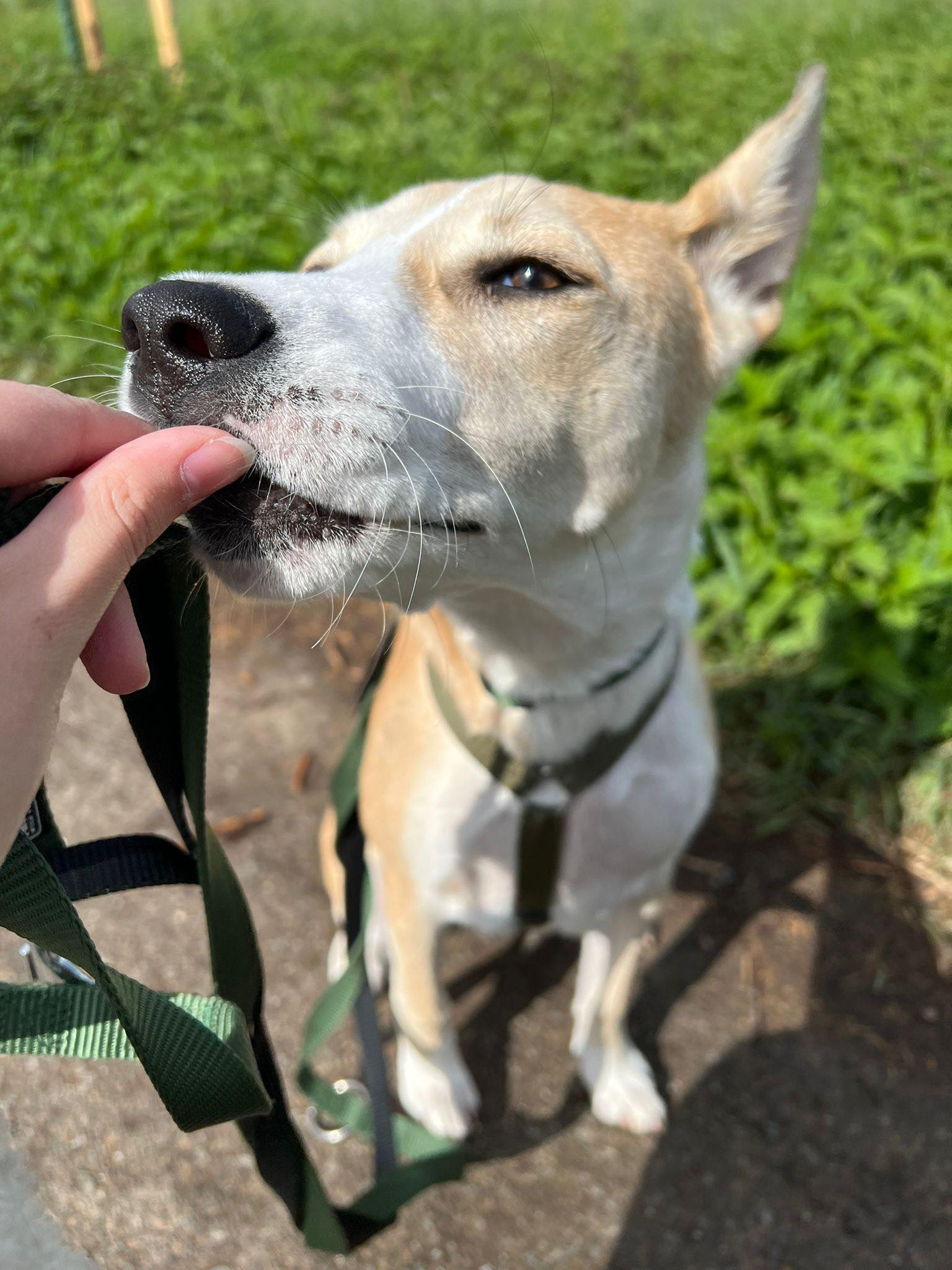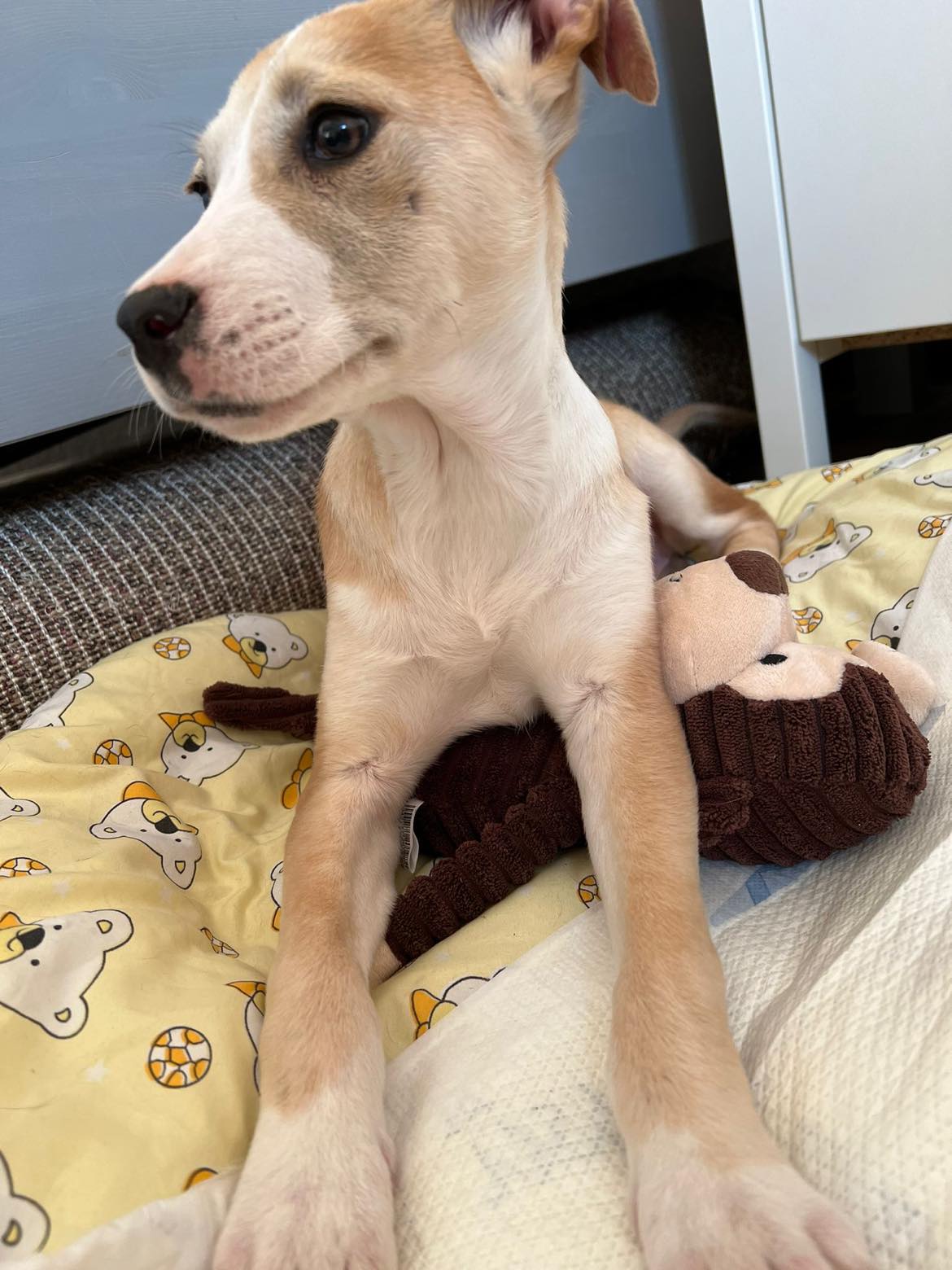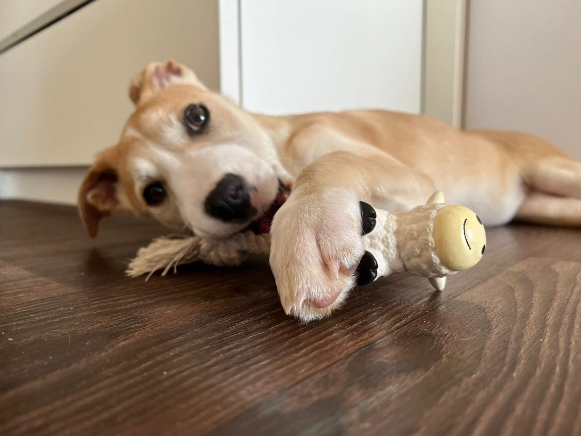 Die kleine Grit ist seit Mitte März 2022 bei uns auf Pflegestelle und ist sehr neugierig, mutig und junghundtypisch verspielt. Sie hat phasenweise viel Energie und liebt es zu mit ihrem Spielzeug zu spielen. Auch Pantoffeln und Schuhe findet sie klasse und trägt sie immer ganz stolz zu ihrem Schlafplatz.