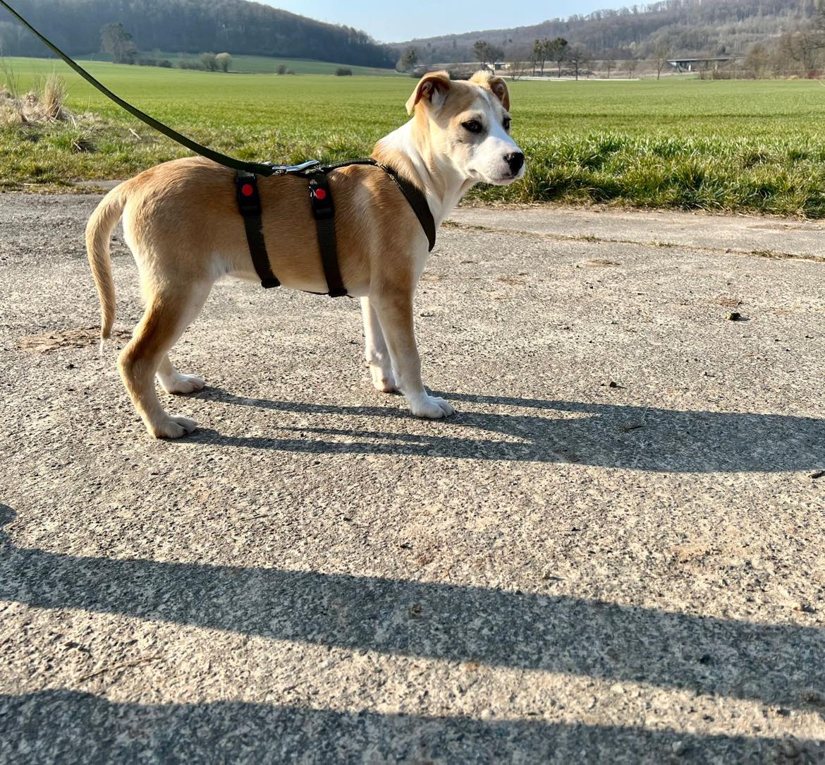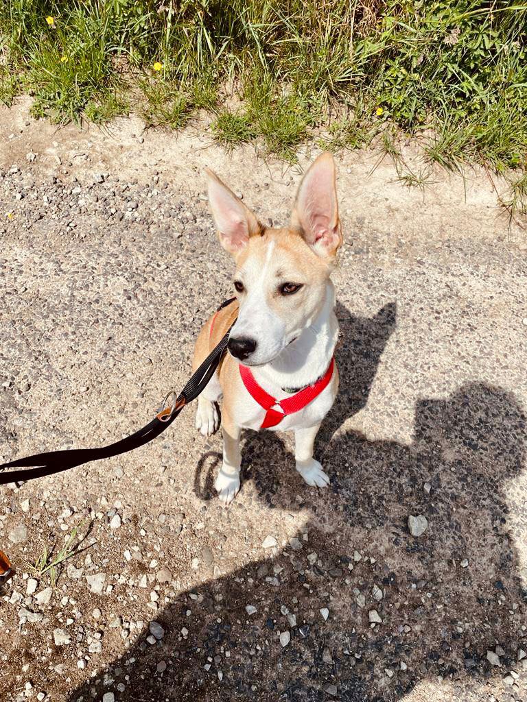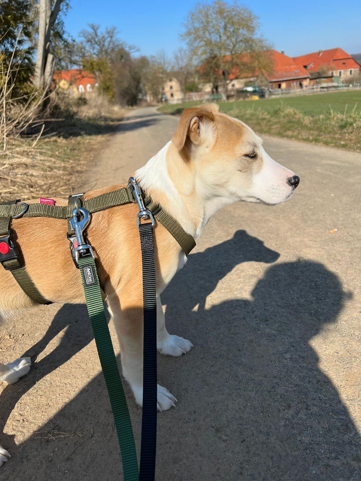 Draußen ist sie in neuen Umgebungen und bei neuen Geräuschen noch unsicher und möchte gerne zurück ins sichere Heim. An der Leine läuft sie meistens gut mit, es sei denn sie sieht etwas was ihr Interesse total weckt. Hier ist noch weiteres Impulskontrollen-Training erforderlich.